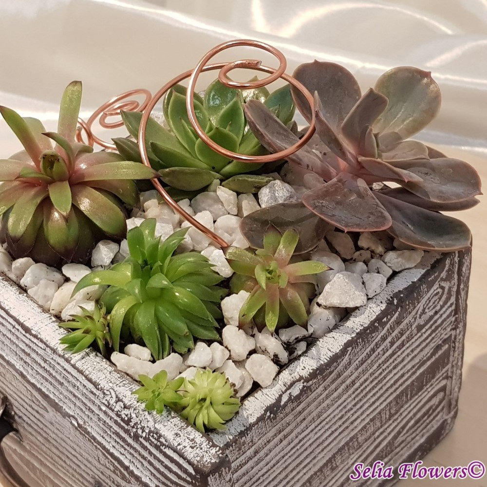 Aranjamentul este decorat cu pietricele de marmura decorativa. Este vesel, decorativ si deloc pretentios. Daca adori calatoriile sau esti plecat mai mult timp de acasa, reprezinta florile ideale, deoarece rezista destul de mult timp fara sa fie udate.