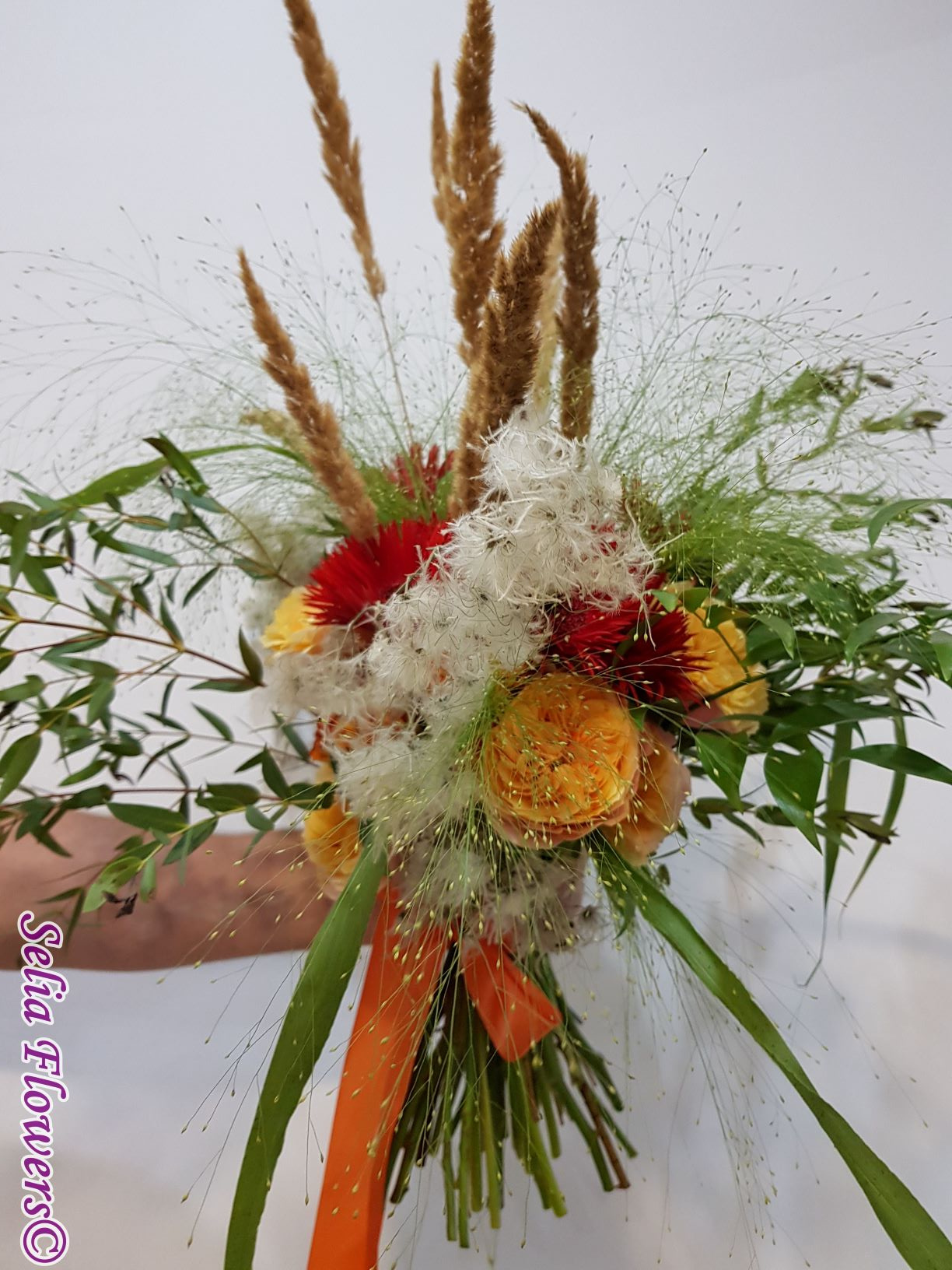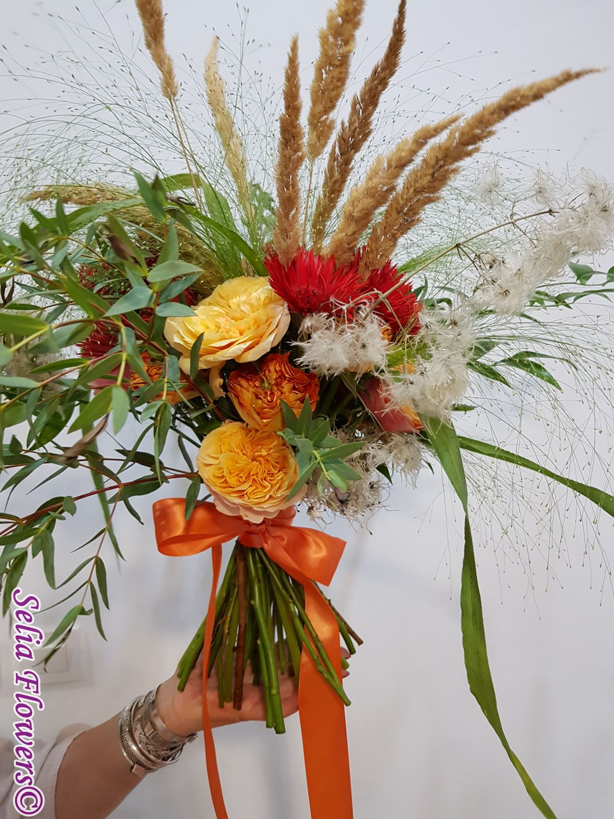 Pentru o persoana draga, un buchet pretios si plin de culoare, construit cu vip roses, clematis salbatic, germini, panicum, material vegetal din flora spontana.