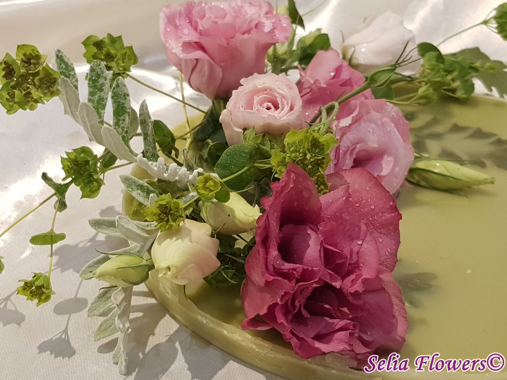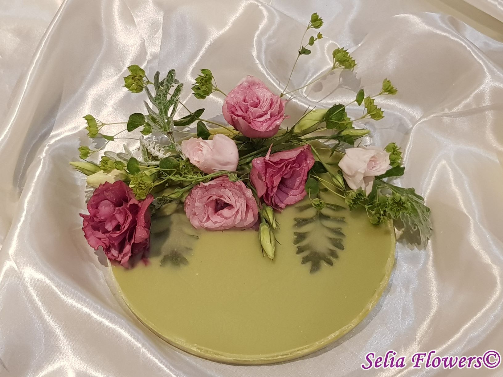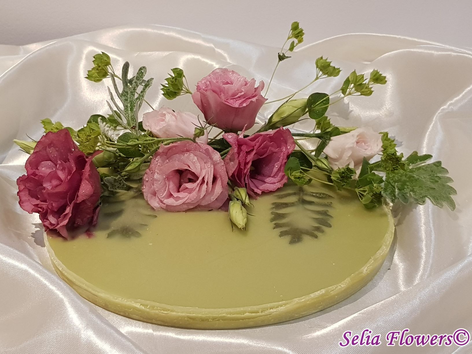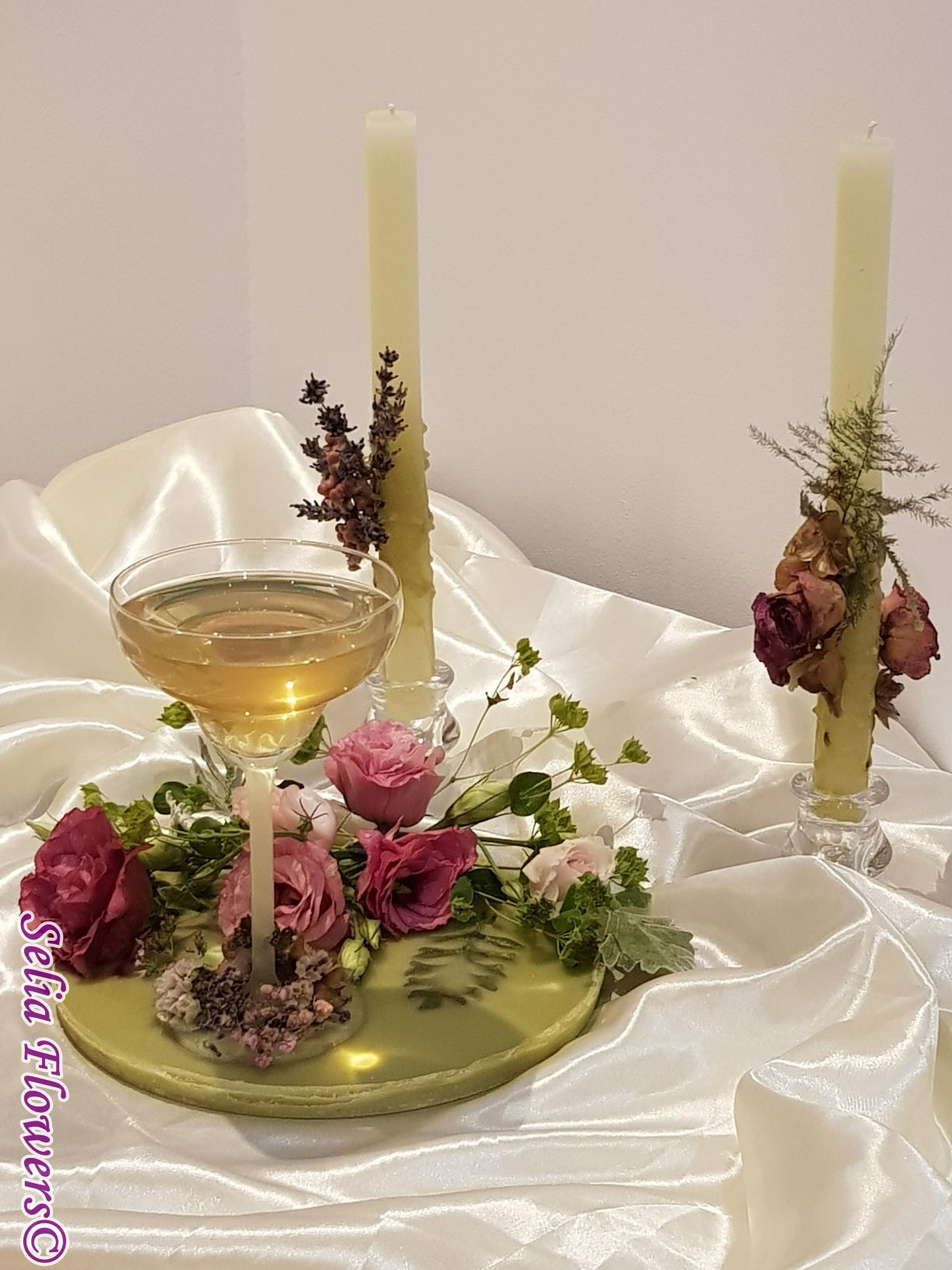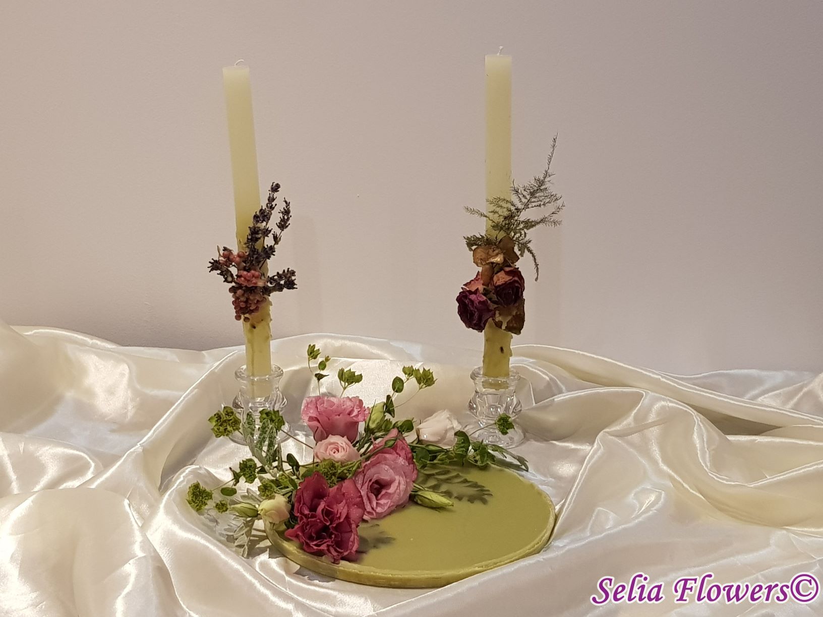 Un platou elegant și original potrivit pentru decorarea mesei, realizat din ceară și decorat cu flori naturale. Este un produs handmade realizat în atelierul floral Selia Flowers. Decorul se poate schimba în funcție de preferințele pentru flori, la fel și culoarea platoului.