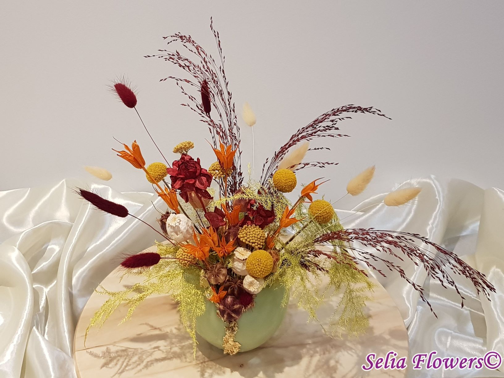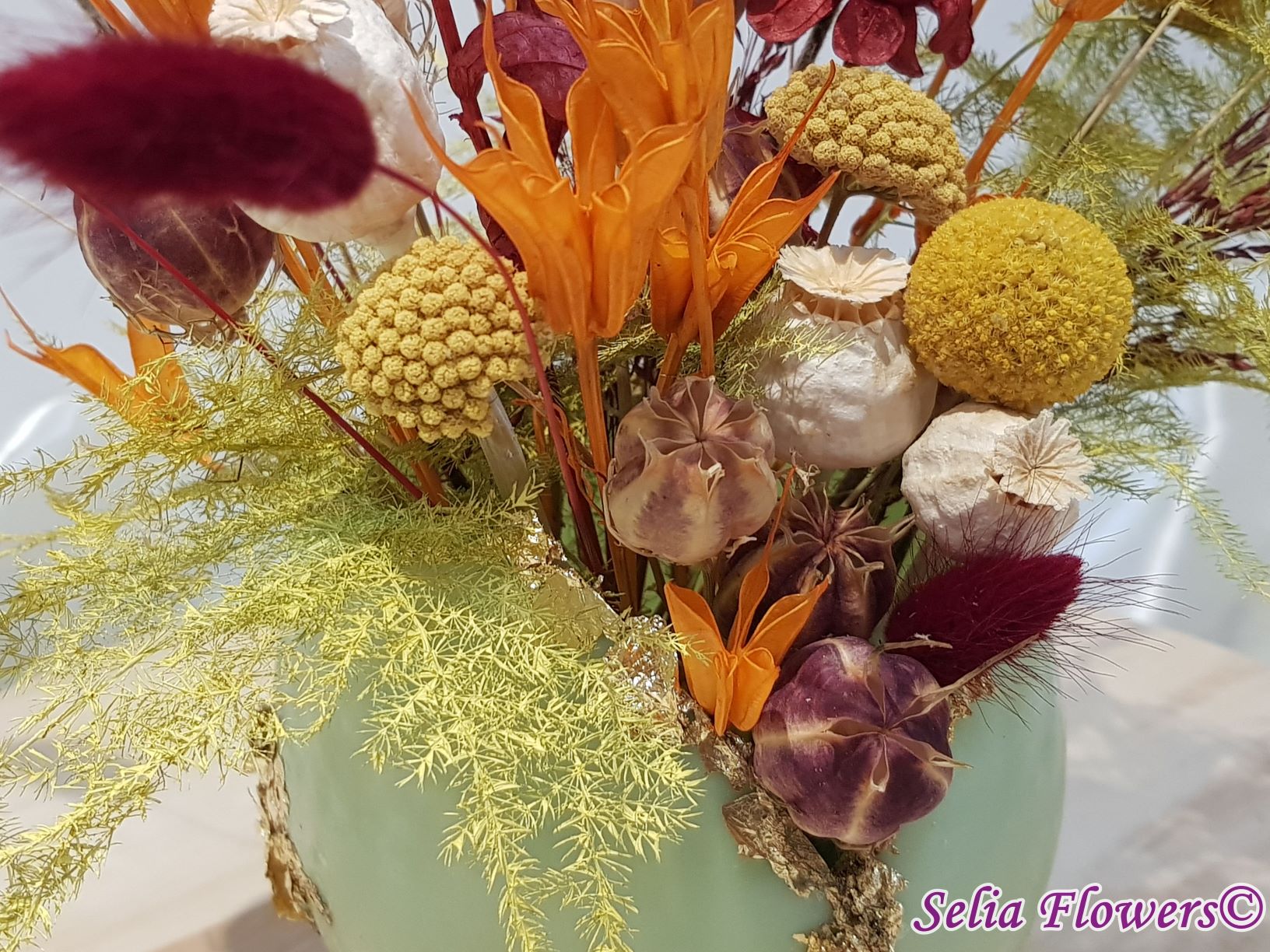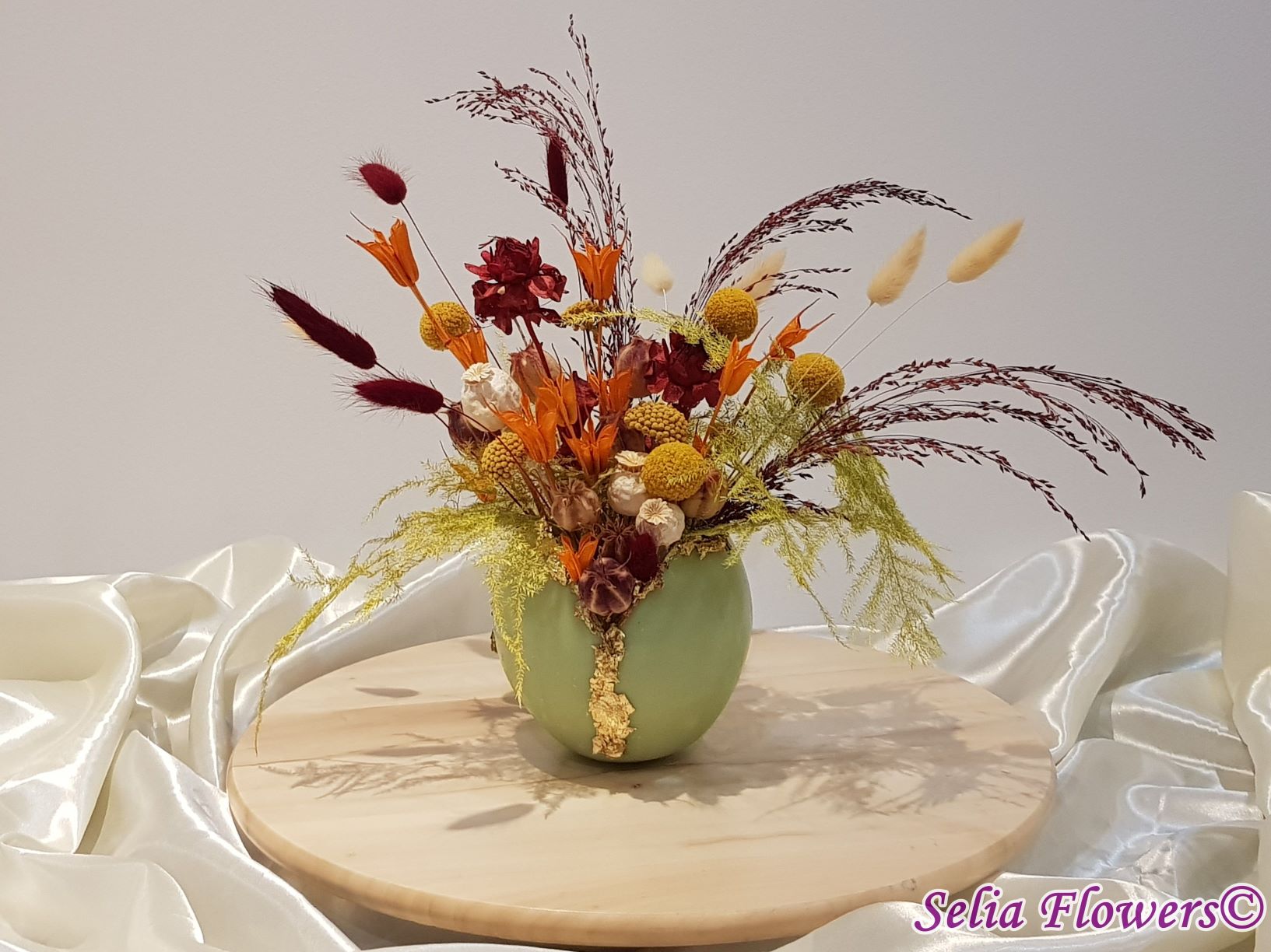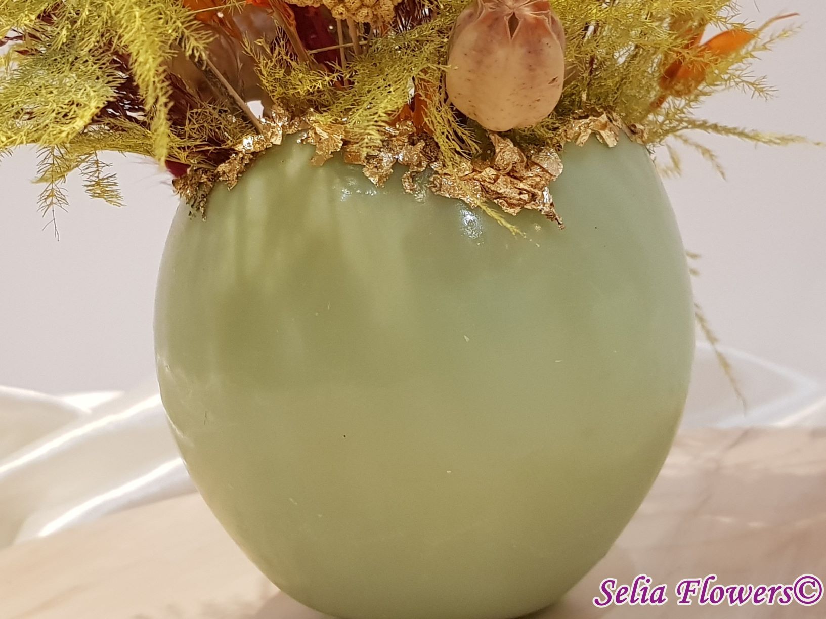 Un vas elegant pentru decorarea mesei, realizat din ceară și prevăzut cu inserție de fulgi din foiță de aur. Vasul este decorat cu flori naturale. Este un produs handmade realizat în atelierul nostru floral.