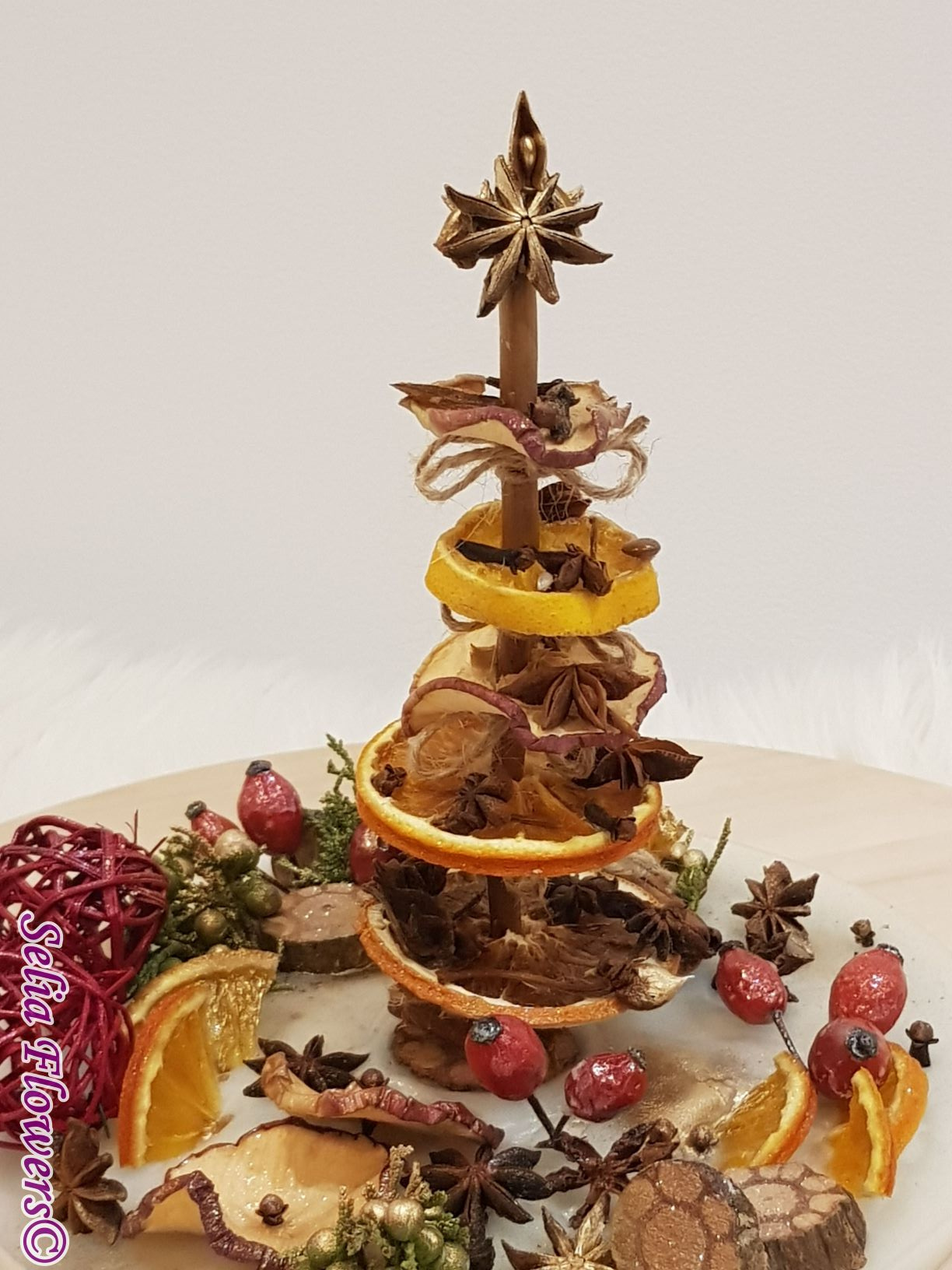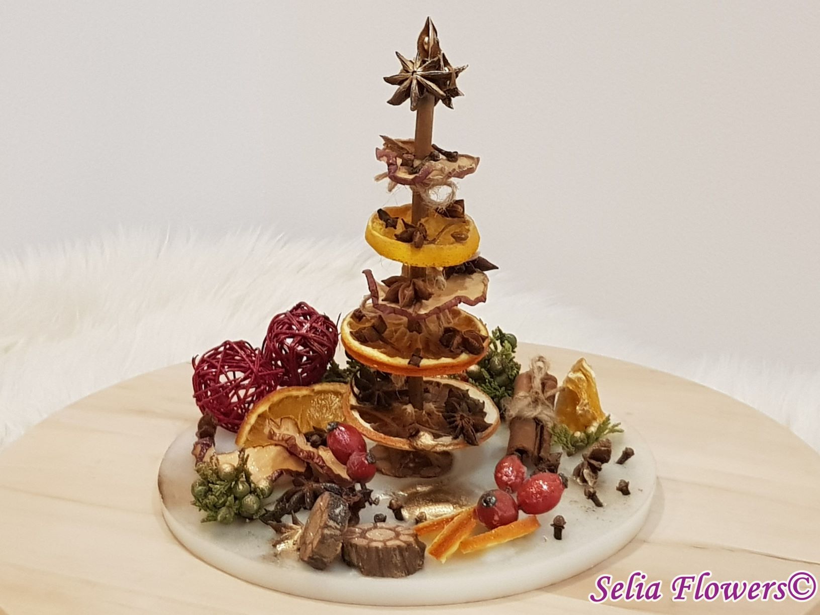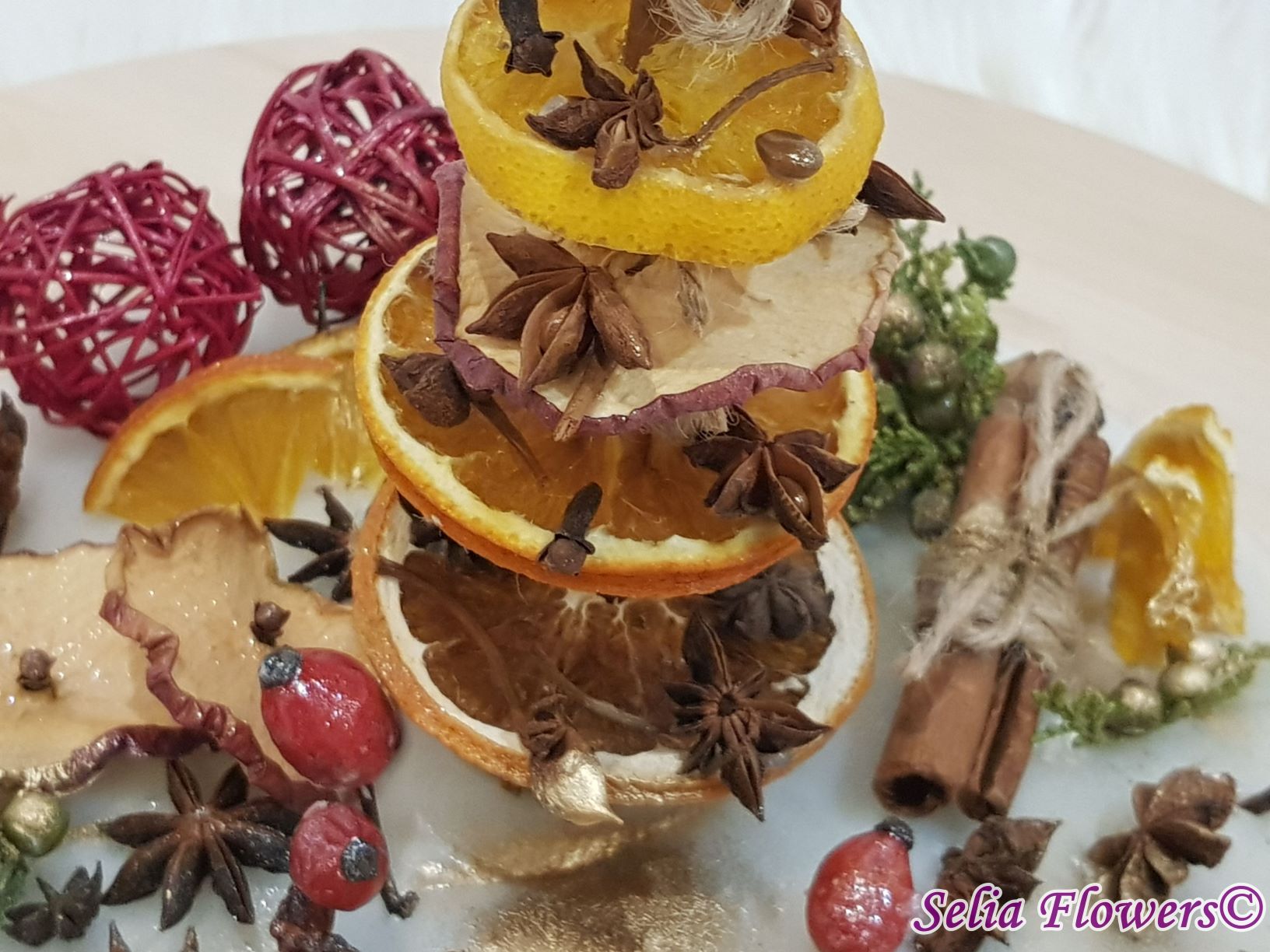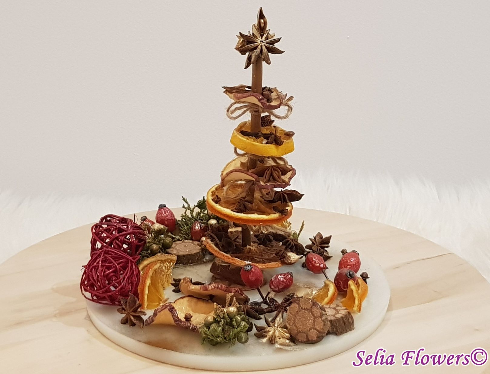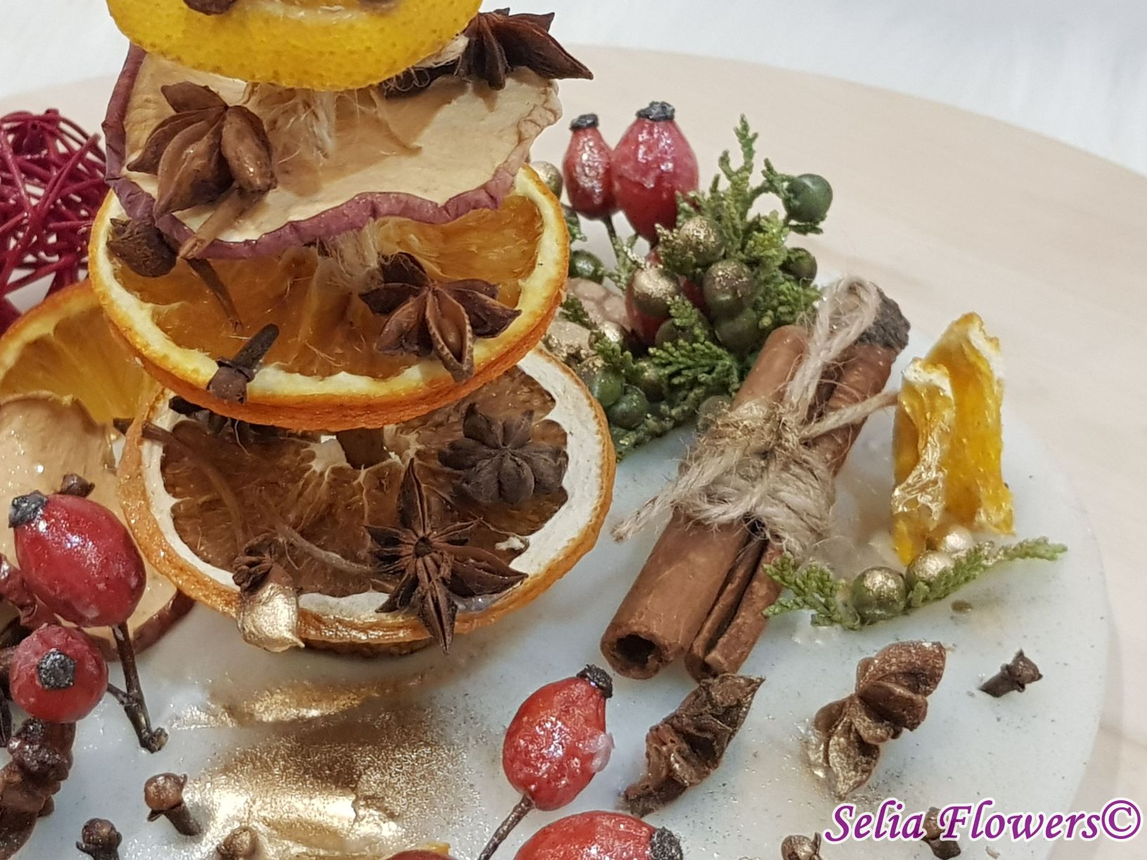 Diametrul aranjamentului este de 25-26 cm si este un produs handmade realizat din ceară in atelierul nostru floral. Este decorat cu bradut construit cu felii de fructe deshidratate (grapefruit, portocala, lamaie, mar), elemente aromatice (scortisoara, anason, cuisoare), crengute de brad, macese si accesorii de sezon.