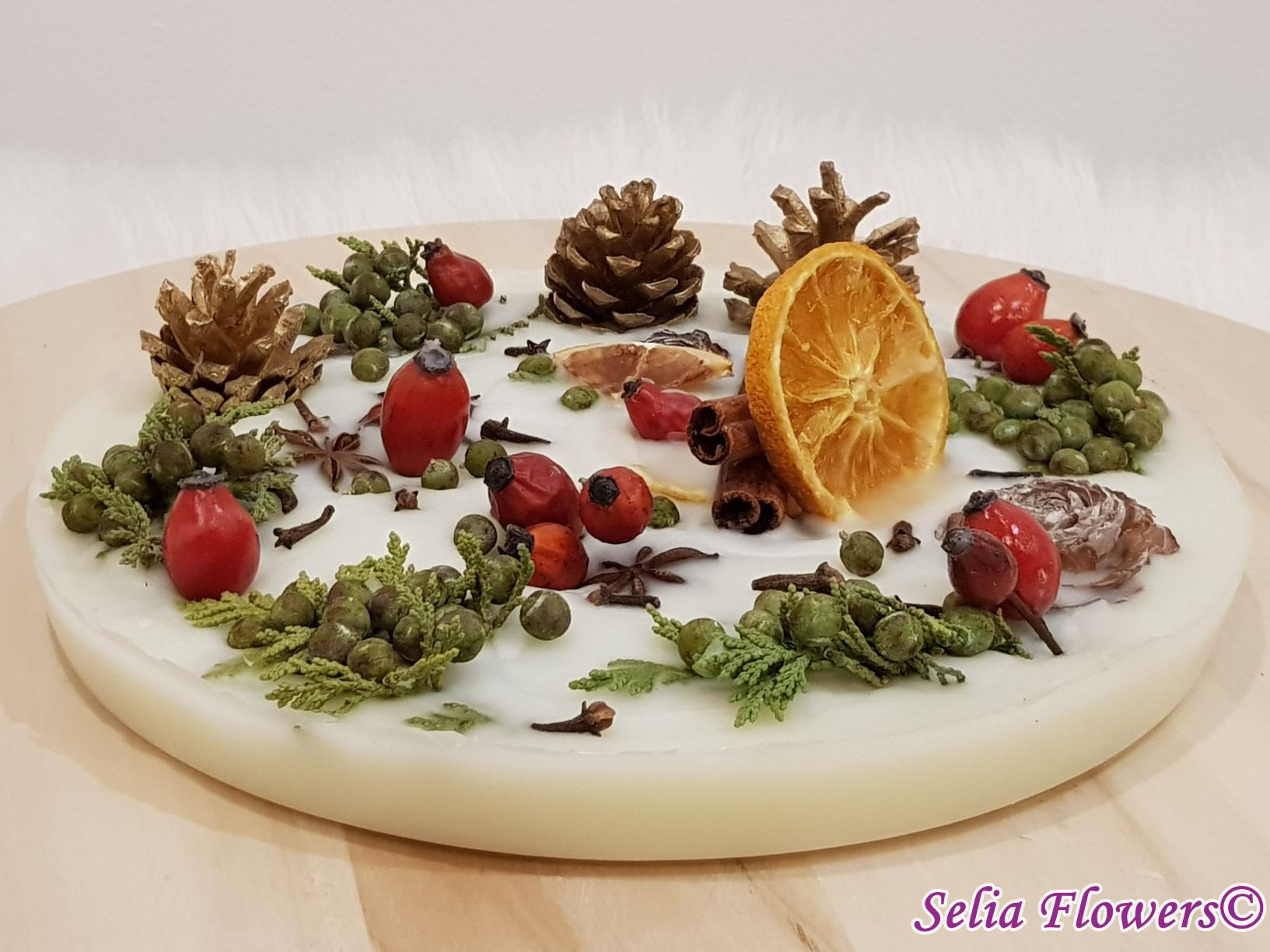 Magie cu miros de sarbatori într-un aranjament cu ceara si elemente decorative aromatice. Este un aranjament unicat si special care aduce Magia si Spiritul Craciunului in casa ta, o idee originala de decor pentru casa in perioada sarbatorilor de iarna.