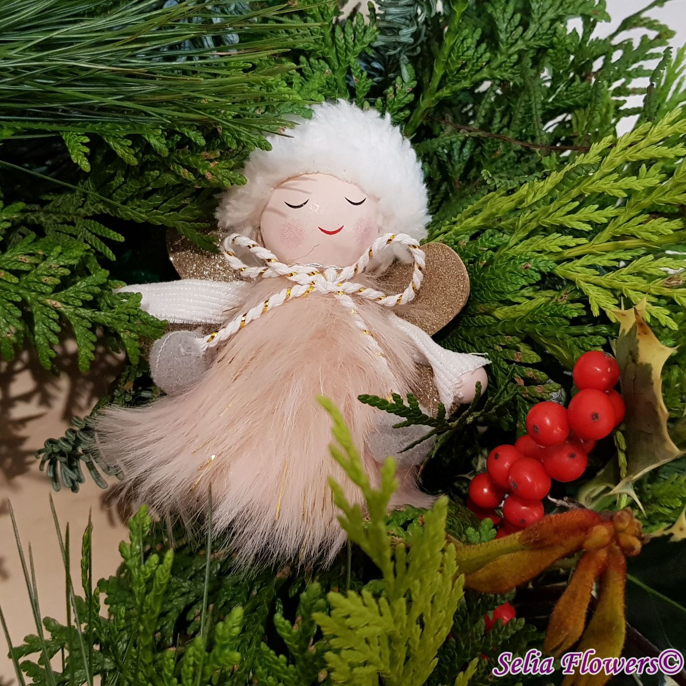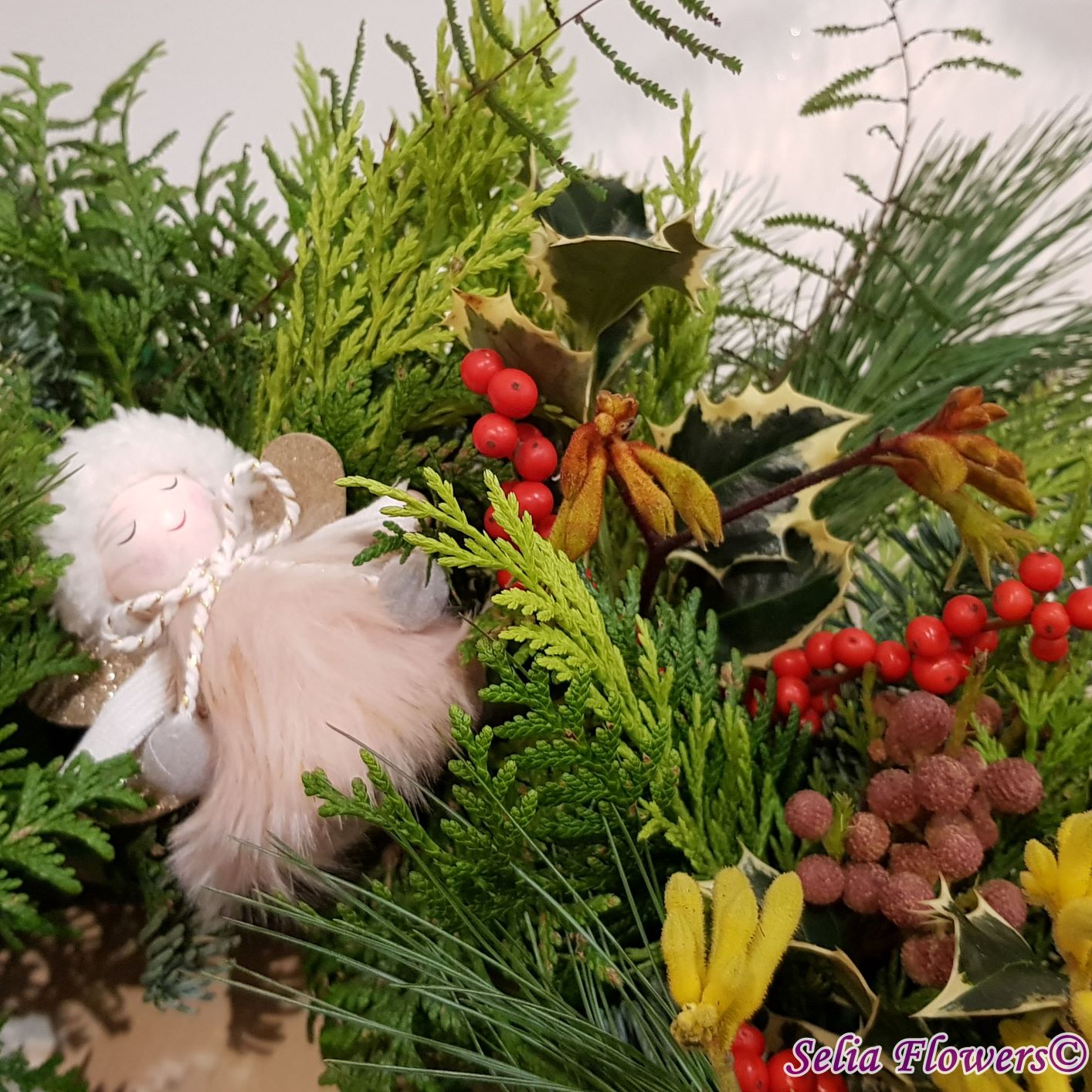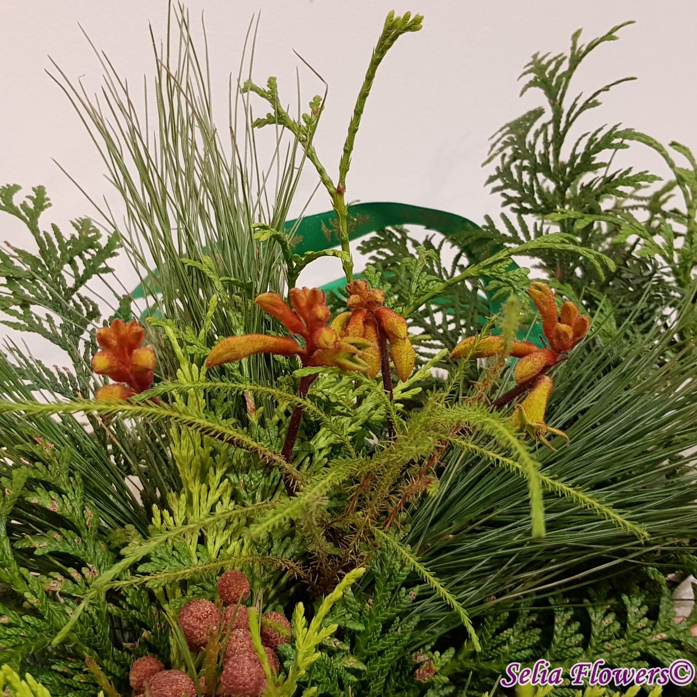 Coronița este construită pe burete floral Oasis, exclusiv din elemente naturale: mix de conifere (brad natural argintiu, tuia și pin), berzelia, ilex , anigozanthos și koralfern. Diametrul coronitei este de 45-48 cm.