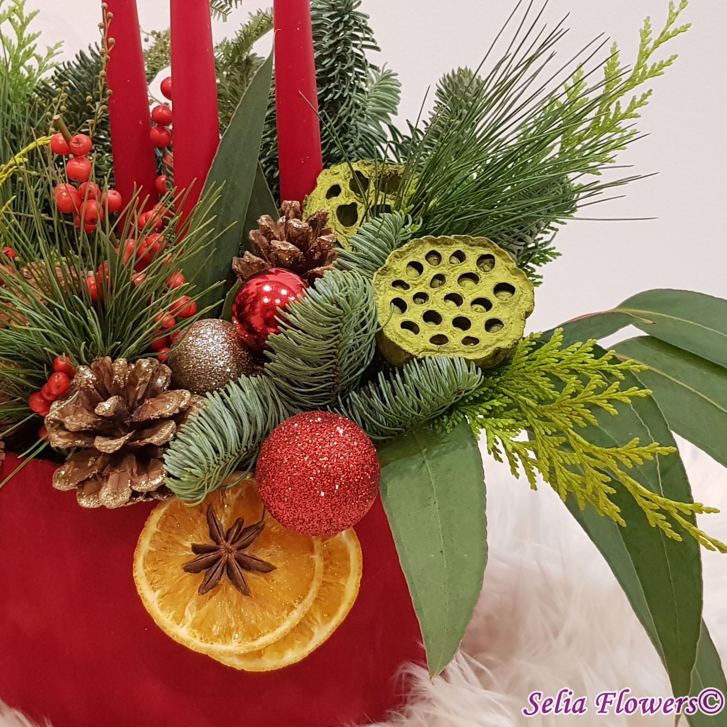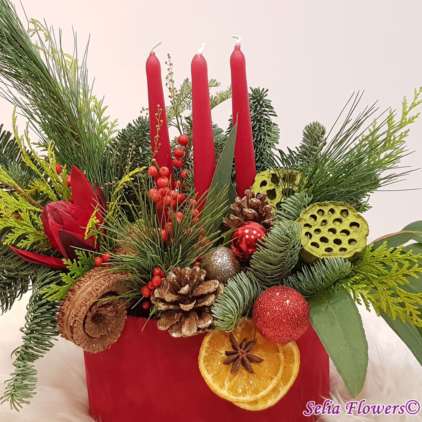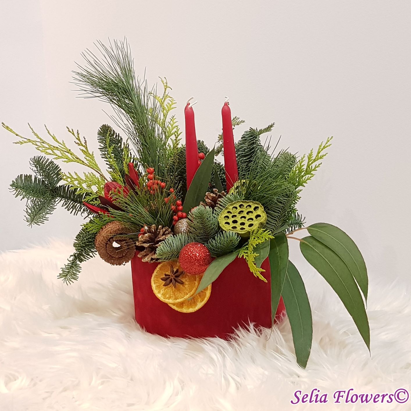 O poveste de Crăciun într-un aranjament rafinat realizat în cutie roșie de catifea din: brad nobilis blue, pin, tuia, crenguțe de eucalypt și ilex. Este accesorizat cu lumânări, felii de portocale deshidratate, batoane de scorțișoară, steluțe de anason, conuri, globulețe și alte accesorii de sezon.