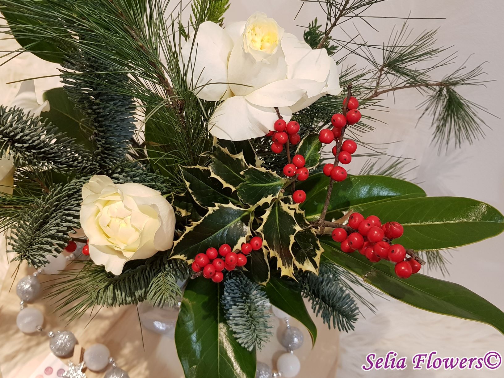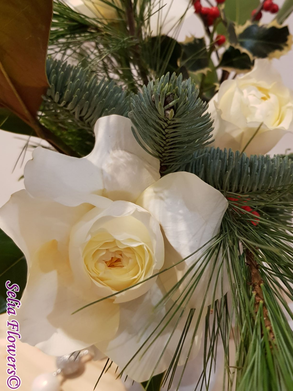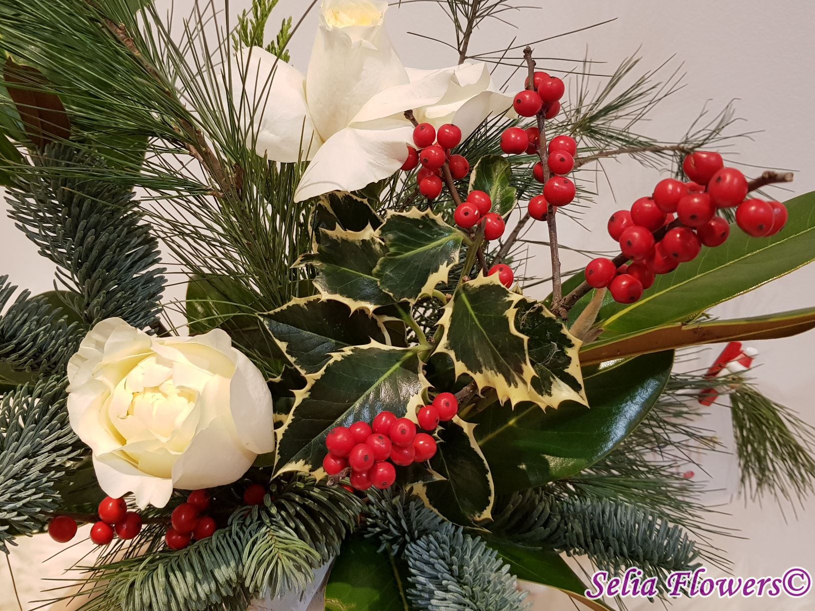 Aranjament în vas Venus, construit în suport de burete umed, cu: trandafiri, crenguțe de ilex, crenguțe de magnolia și mix de conifere.
