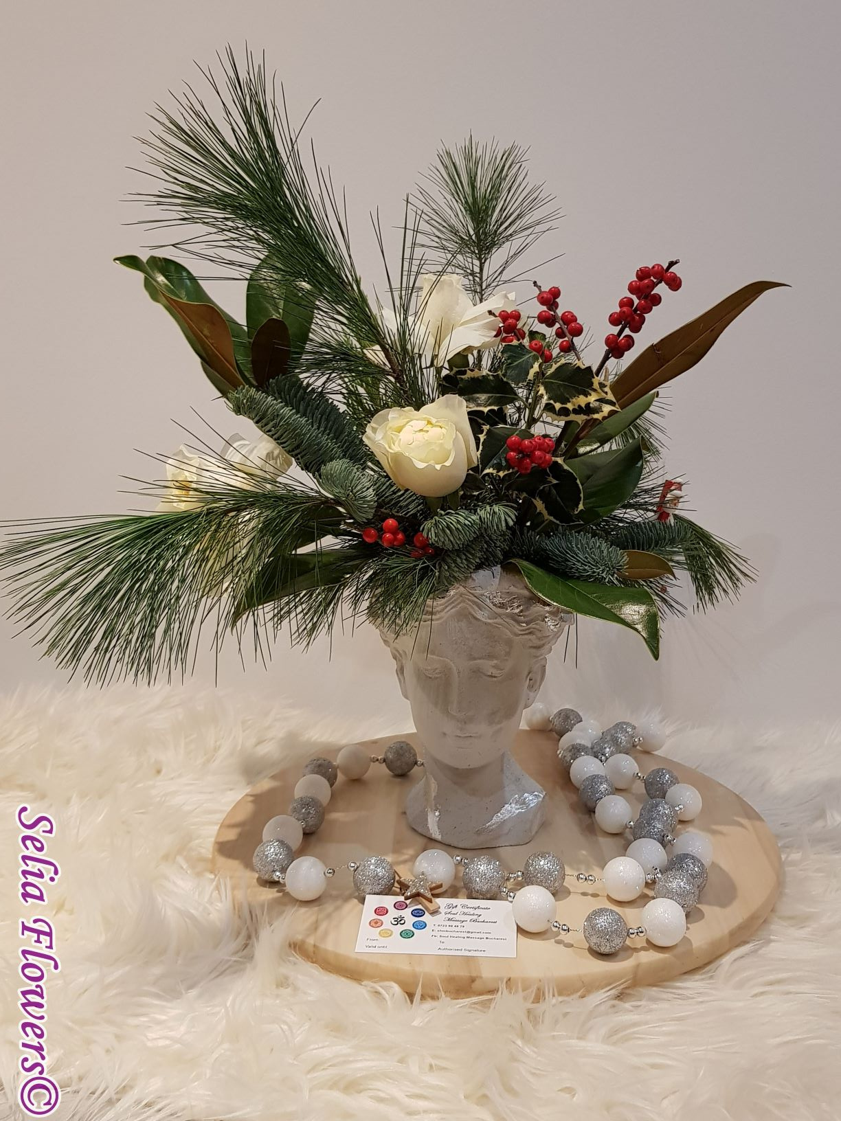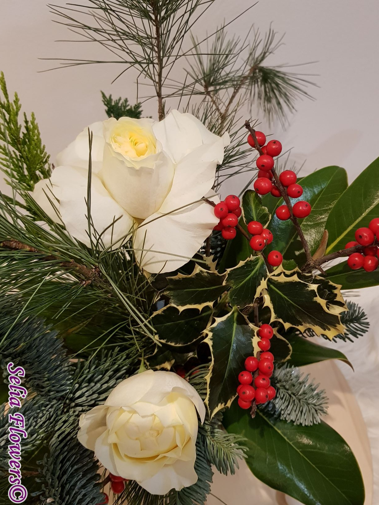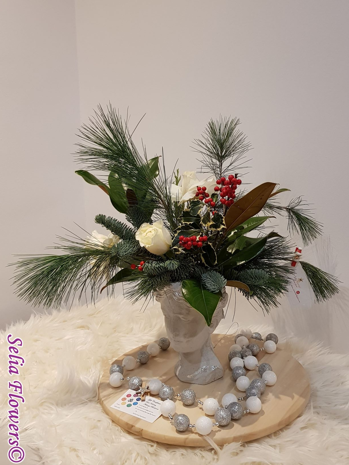 Aranjament în vas Venus, construit în suport de burete umed, cu: trandafiri, crenguțe de ilex, crenguțe de magnolia și mix de conifere.