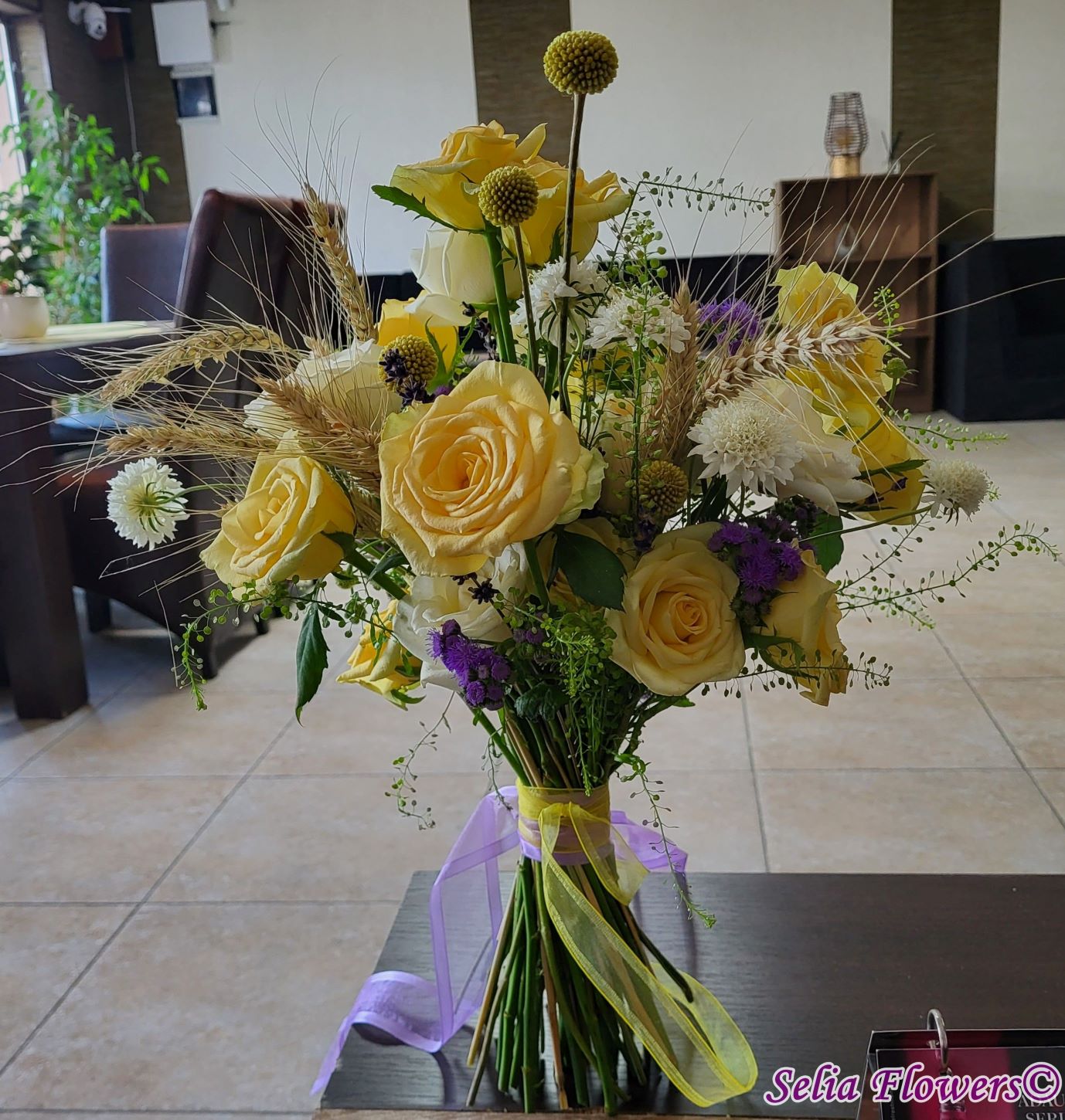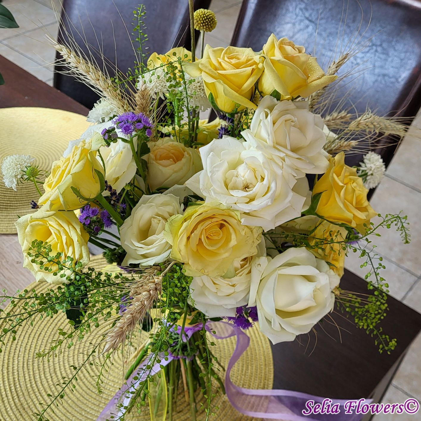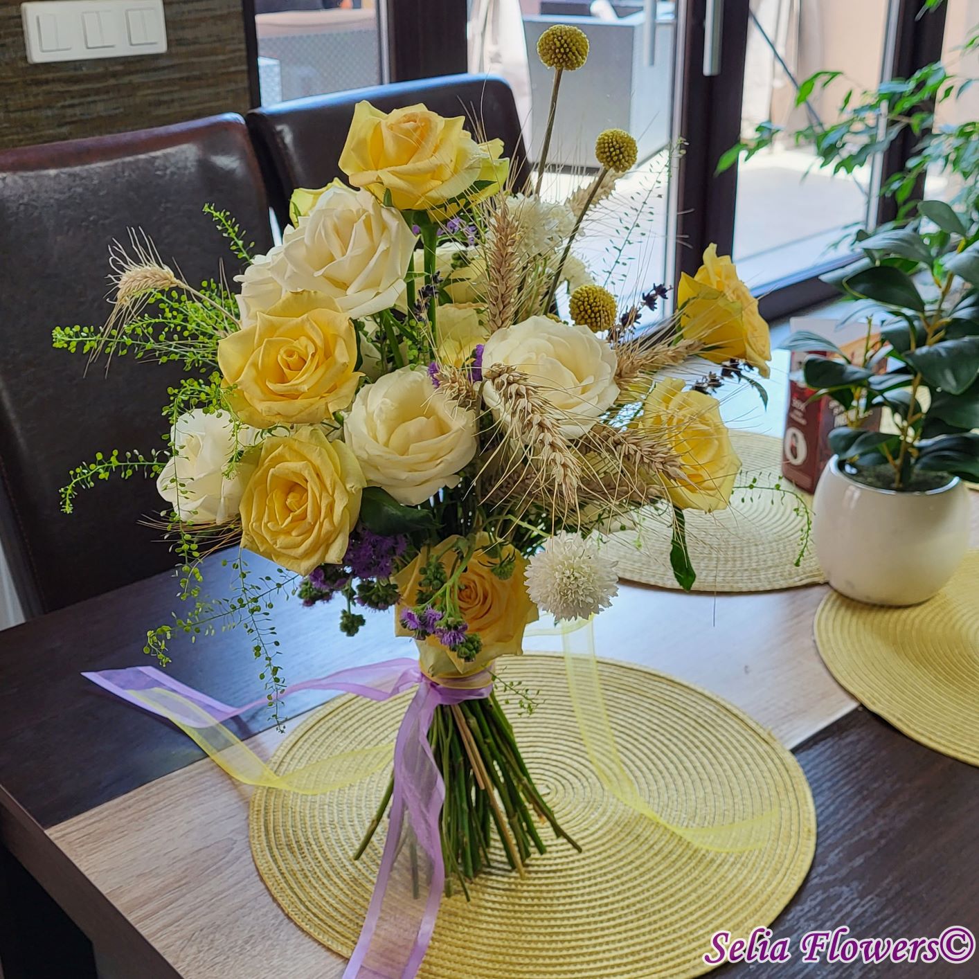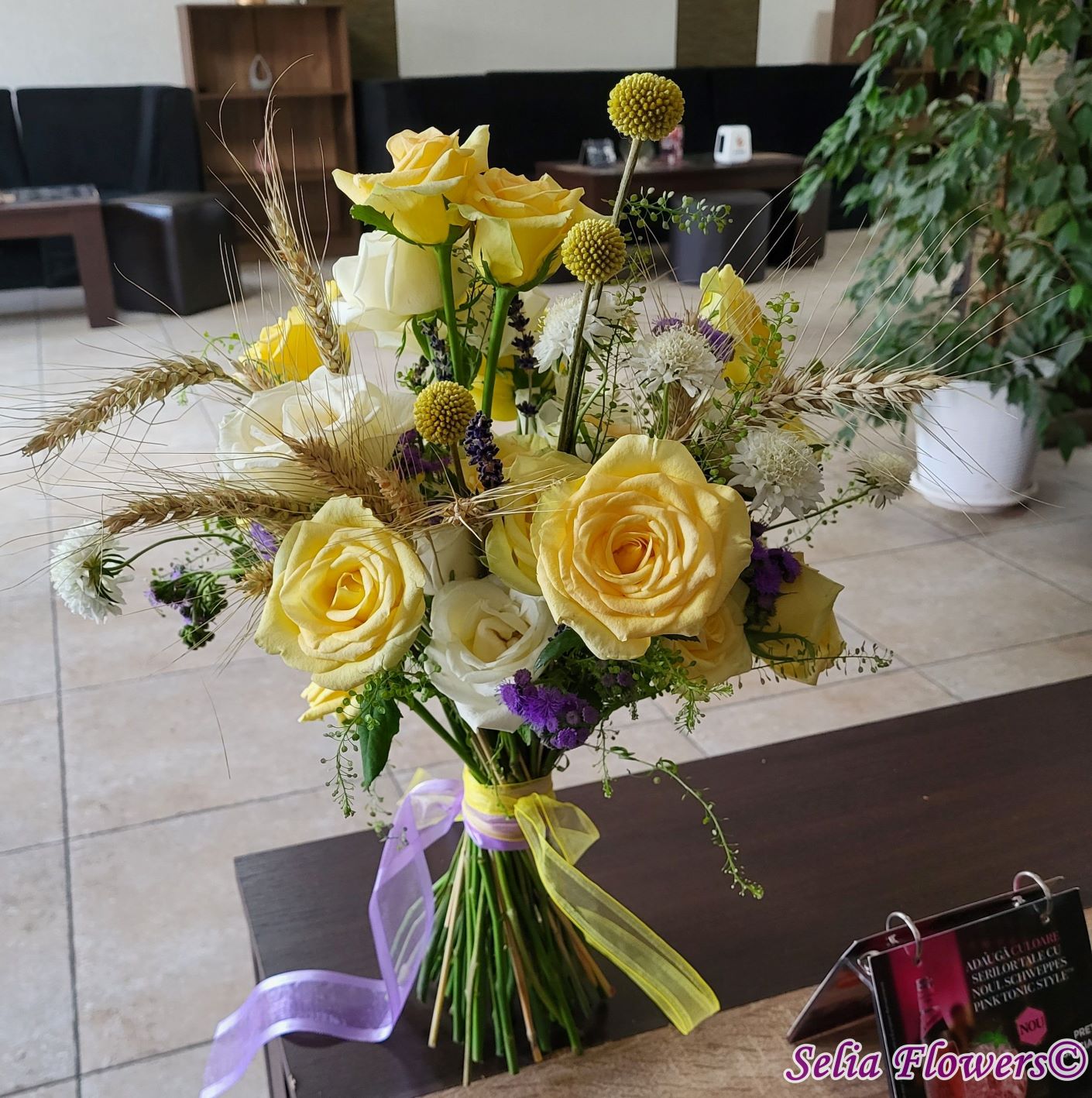 Dacă ar fi să luăm în considerare ce simbolizează florile care compun buchetul, precum și cromatica lor (trandafiri albi și galbeni, spice de grâu, lavandă mov, scabiosa albă, ageratum mov, craspedia), aș putea spune că este un buchet plin de semnificații în același timp. El simbolizează: eleganță, bucurie, veselie, romantism, fericire, emoții vesele, puritate, respect, belșug, abundență.