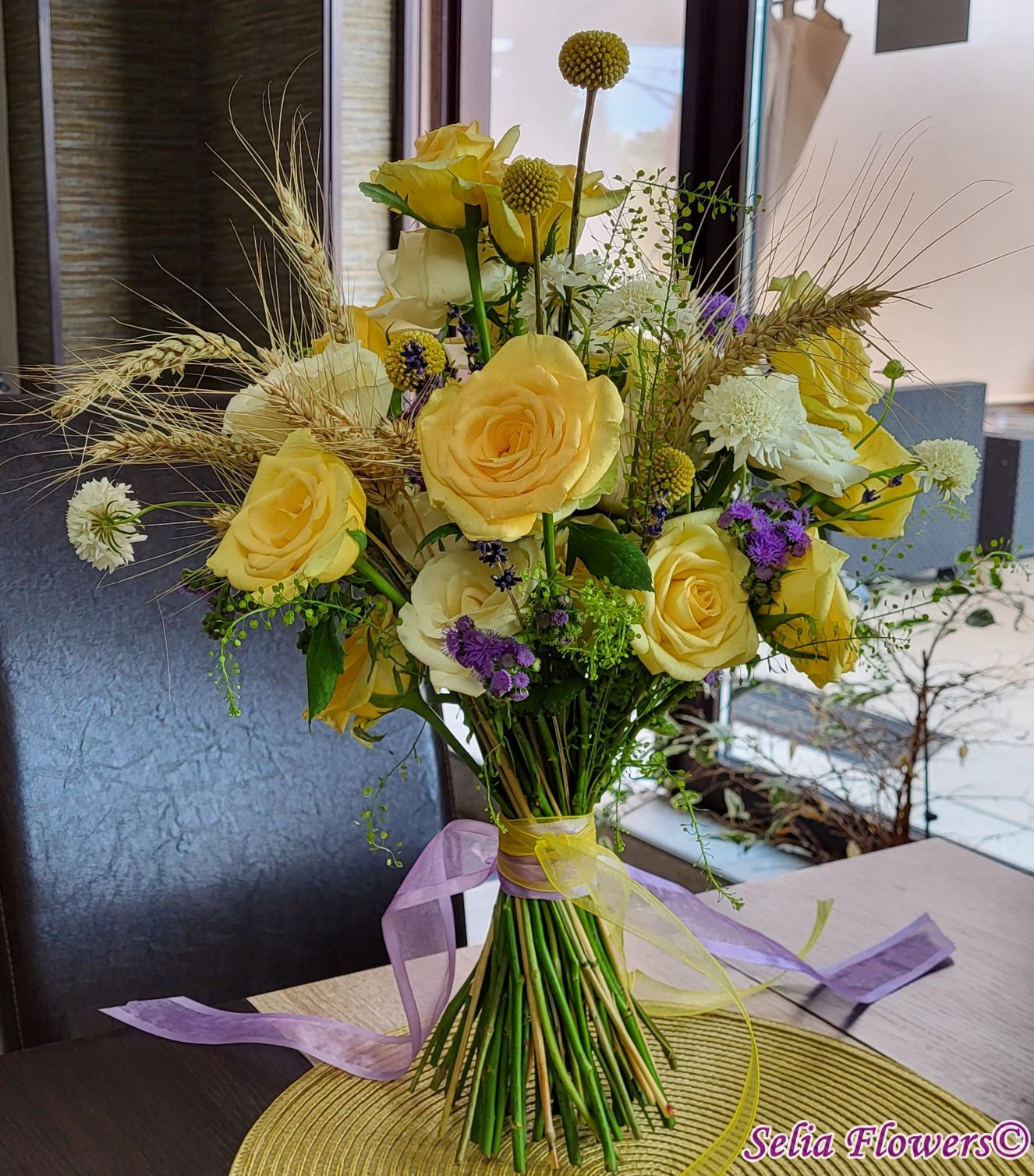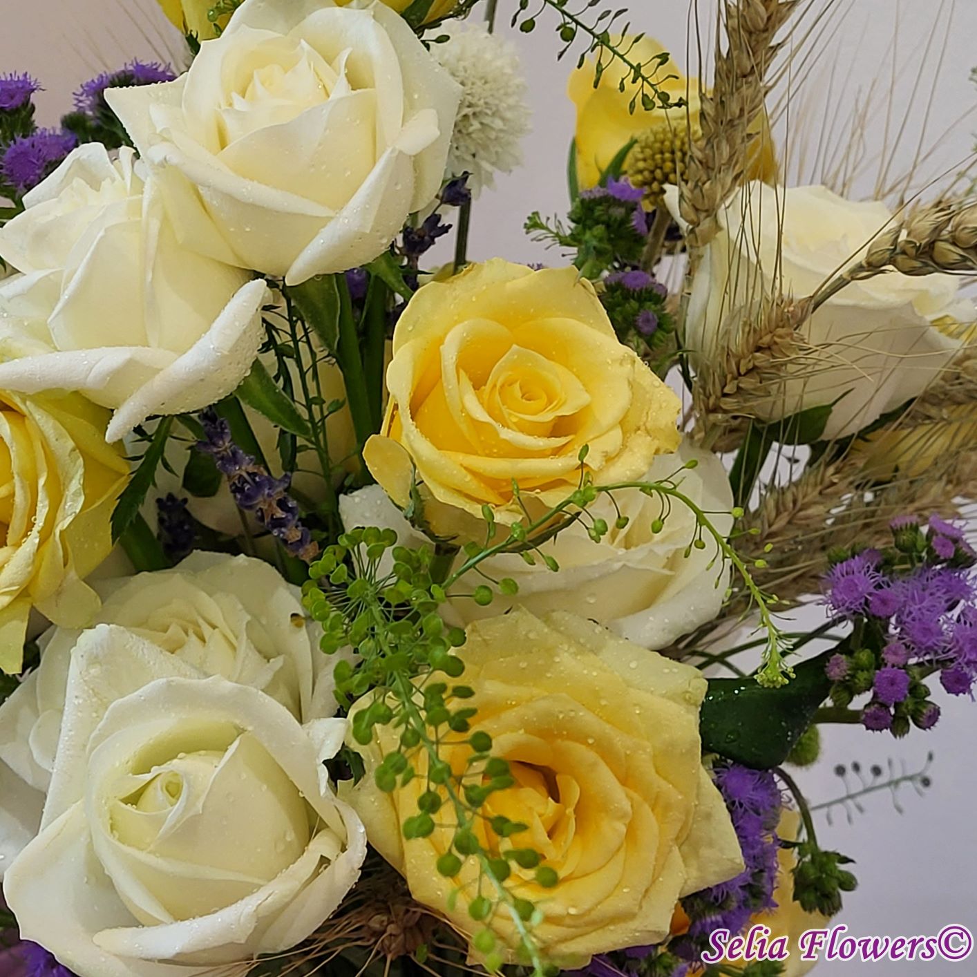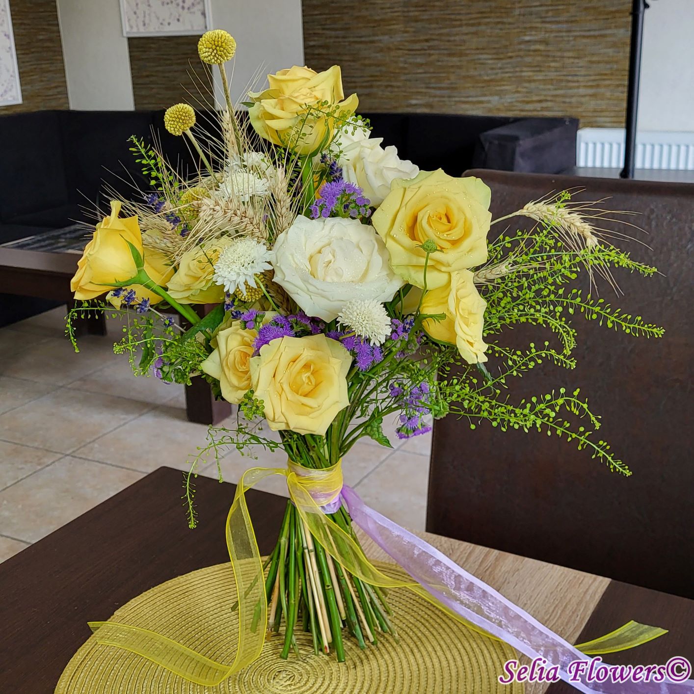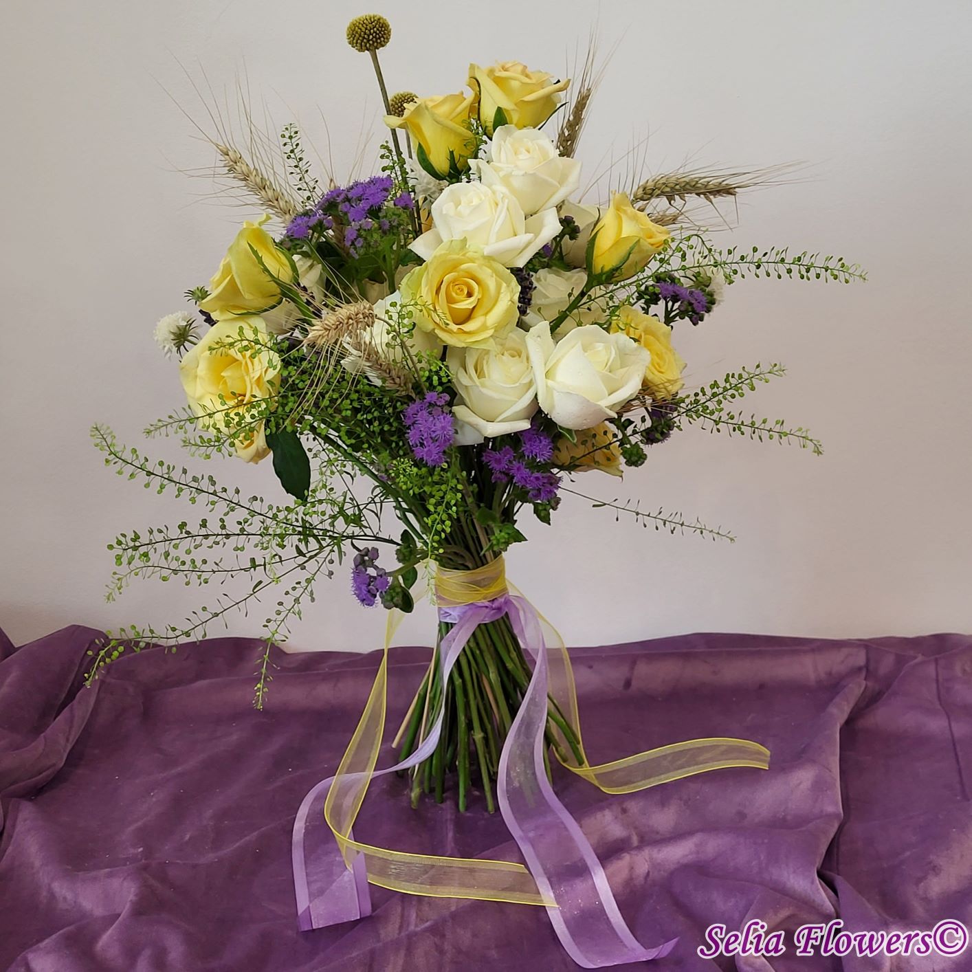 Dacă ar fi să luăm în considerare ce simbolizează florile care compun buchetul, precum și cromatica lor (trandafiri albi și galbeni, spice de grâu, lavandă mov, scabiosa albă, ageratum mov, craspedia), aș putea spune că este un buchet plin de semnificații în același timp. El simbolizează: eleganță, bucurie, veselie, romantism, fericire, emoții vesele, puritate, respect, belșug, abundență.