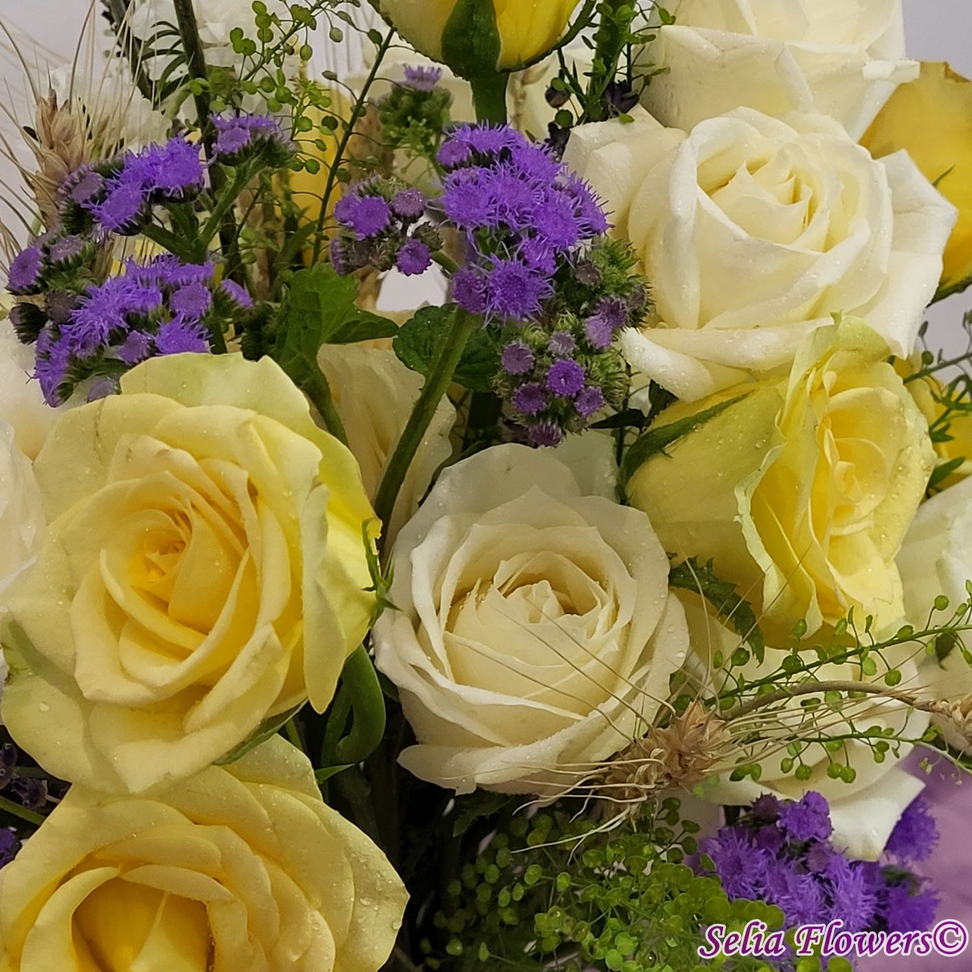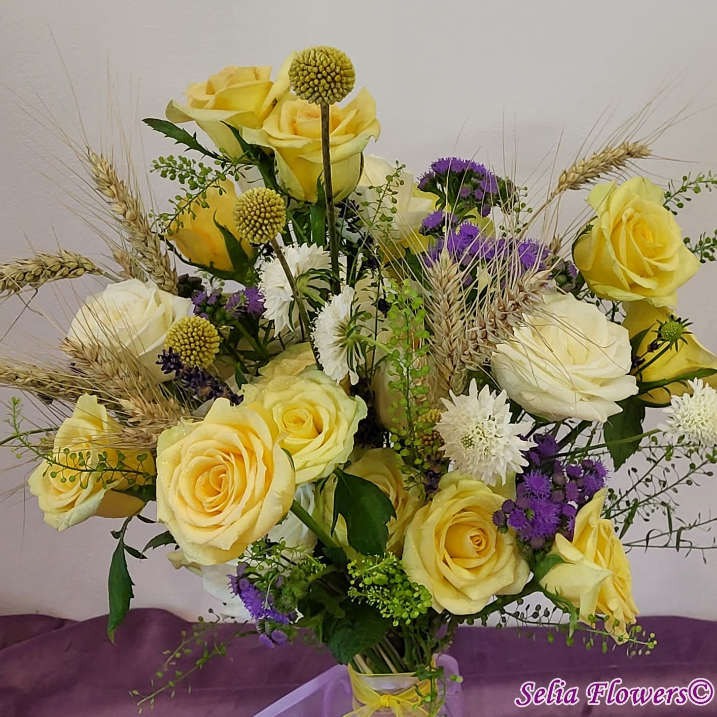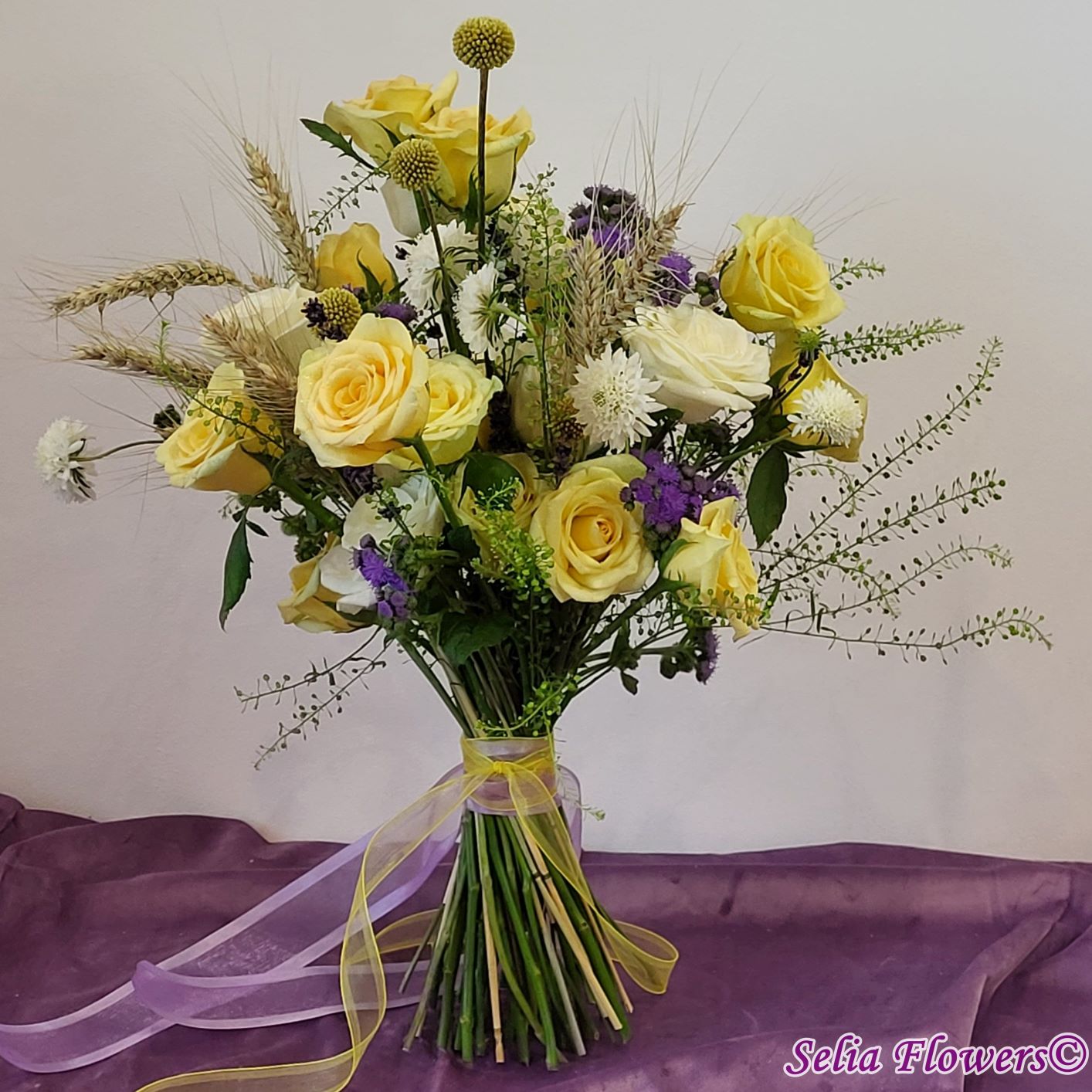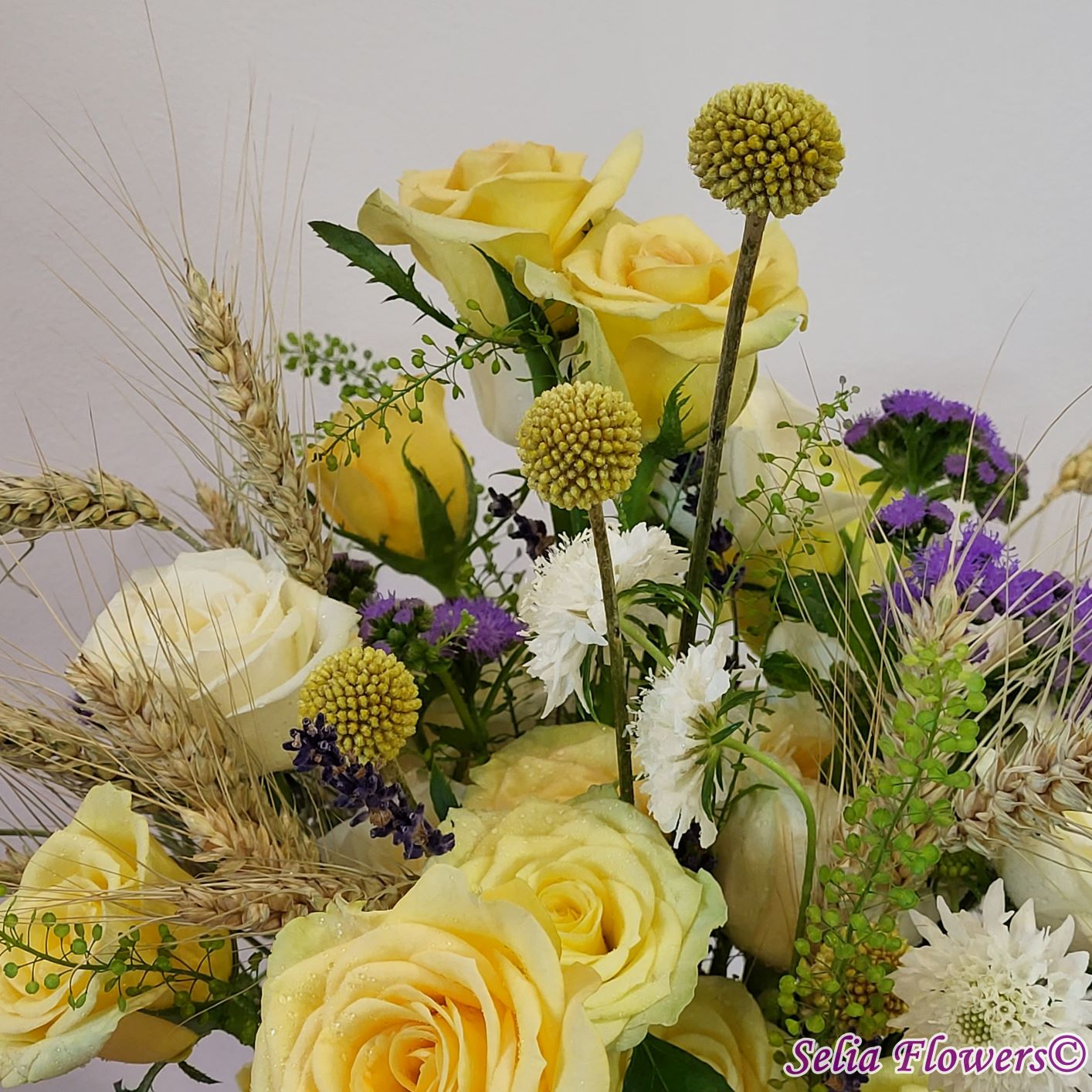 Dacă ar fi să luăm în considerare ce simbolizează florile care compun buchetul, precum și cromatica lor (trandafiri albi și galbeni, spice de grâu, lavandă mov, scabiosa albă, ageratum mov, craspedia), aș putea spune că este un buchet plin de semnificații în același timp. El simbolizează: eleganță, bucurie, veselie, romantism, fericire, emoții vesele, puritate, respect, belșug, abundență.