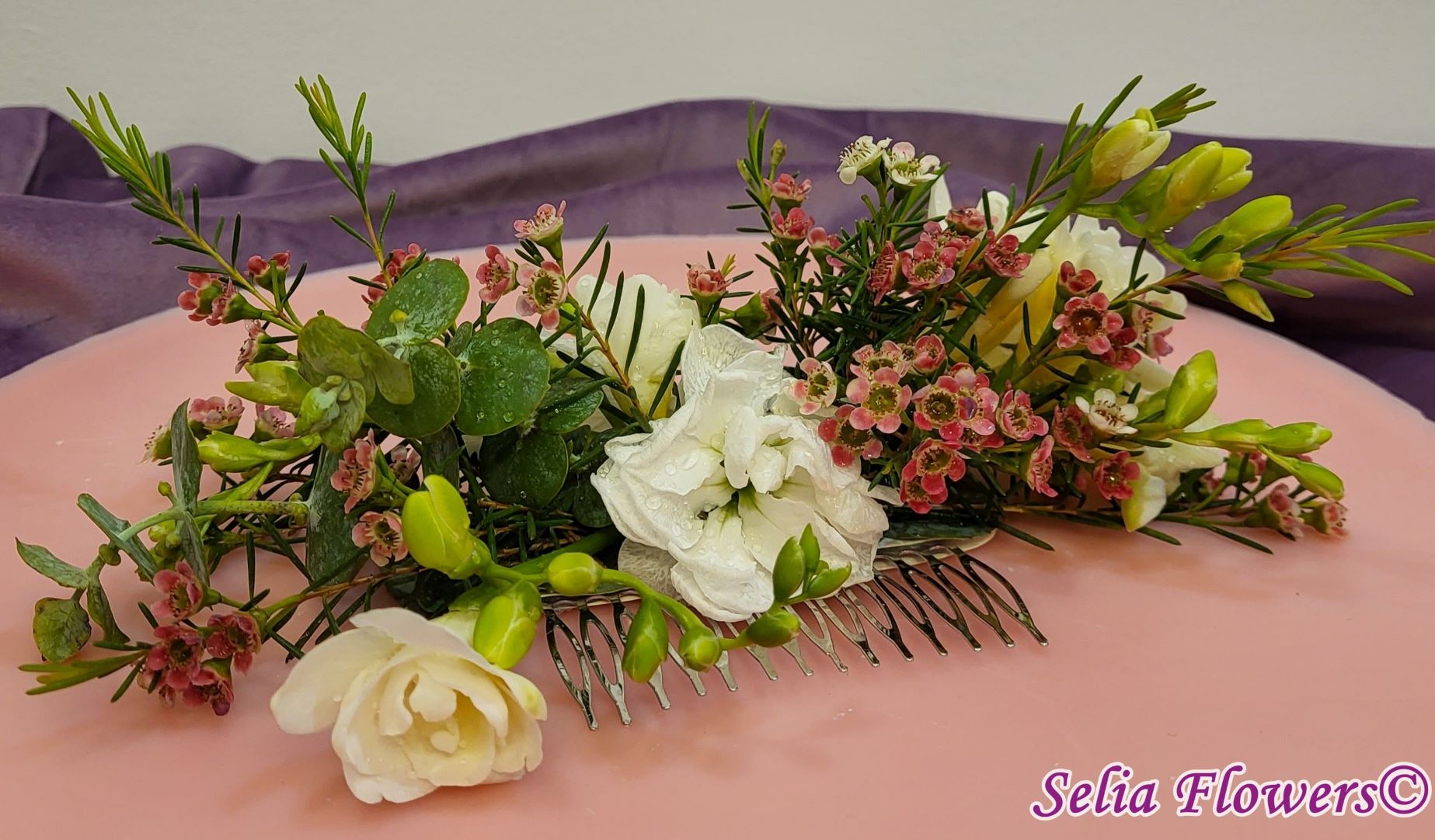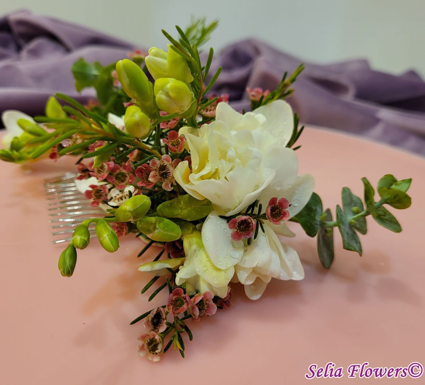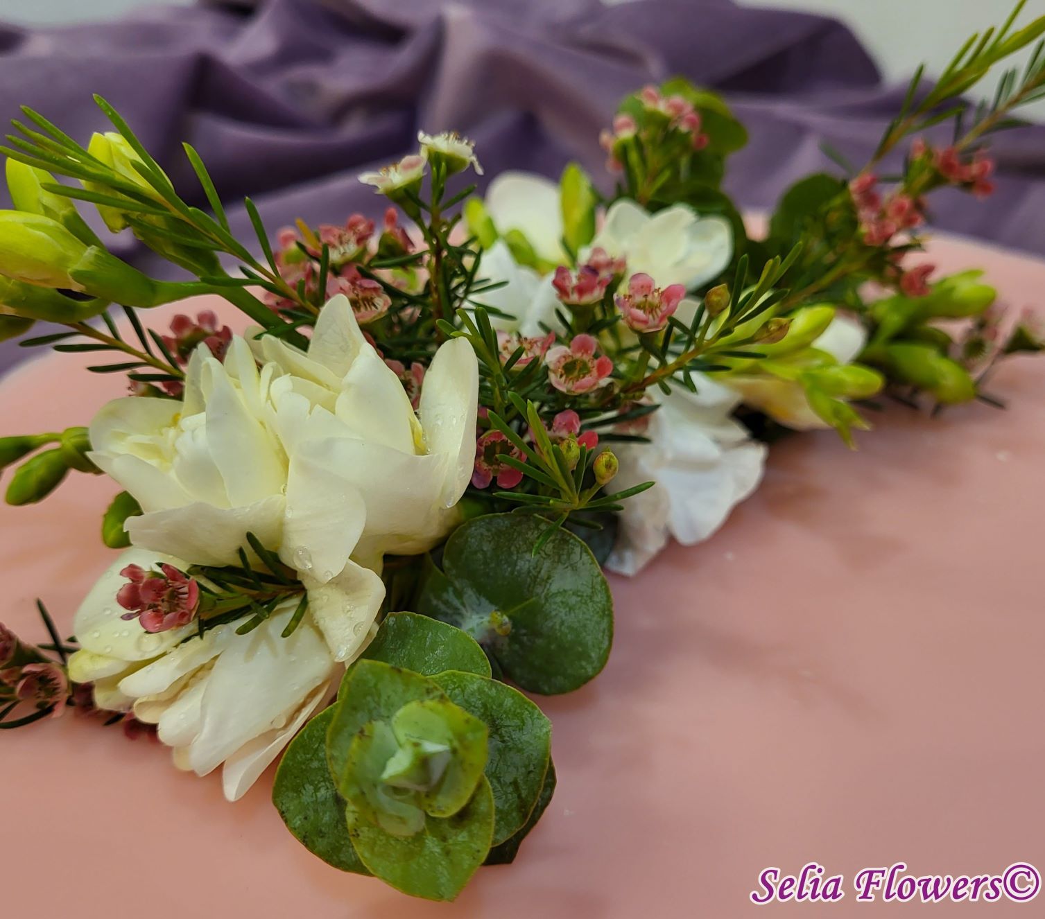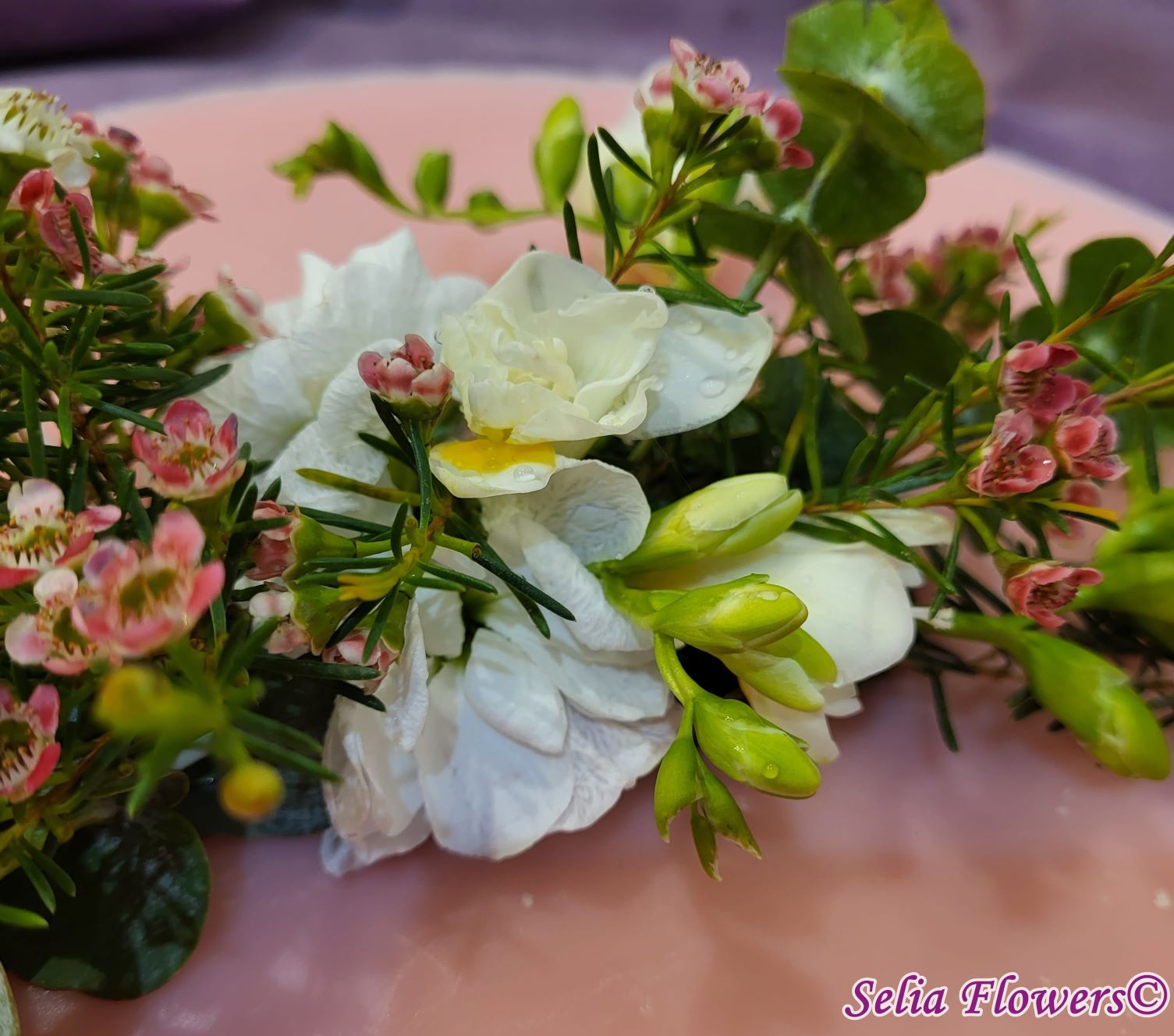 Compoziție florală: frezii, flori de mathiola, wax flowers, eucalipt.