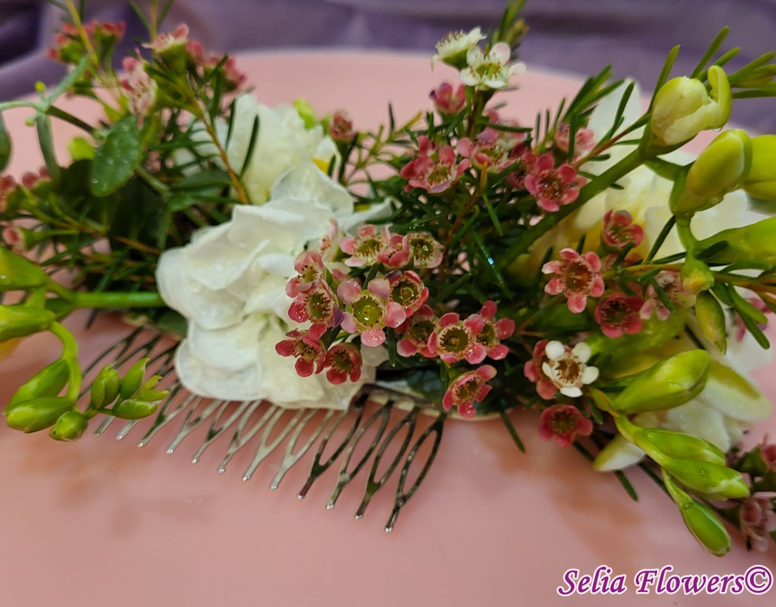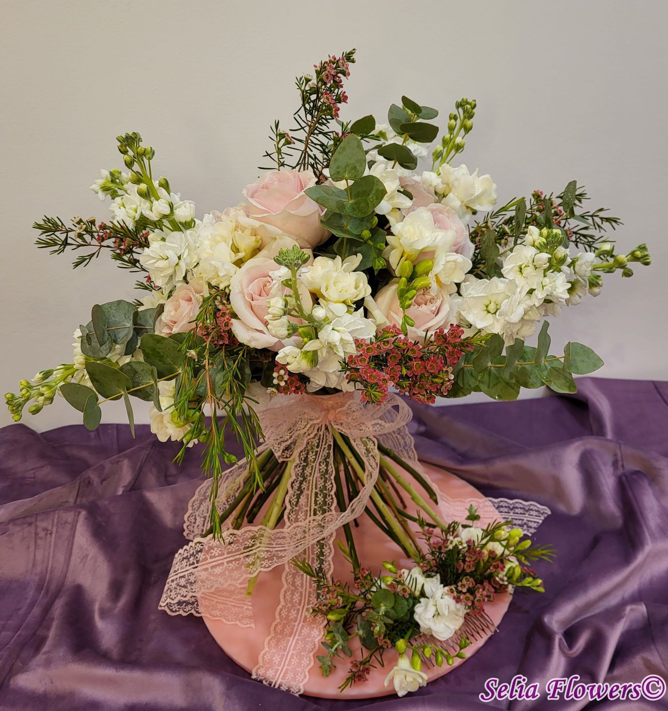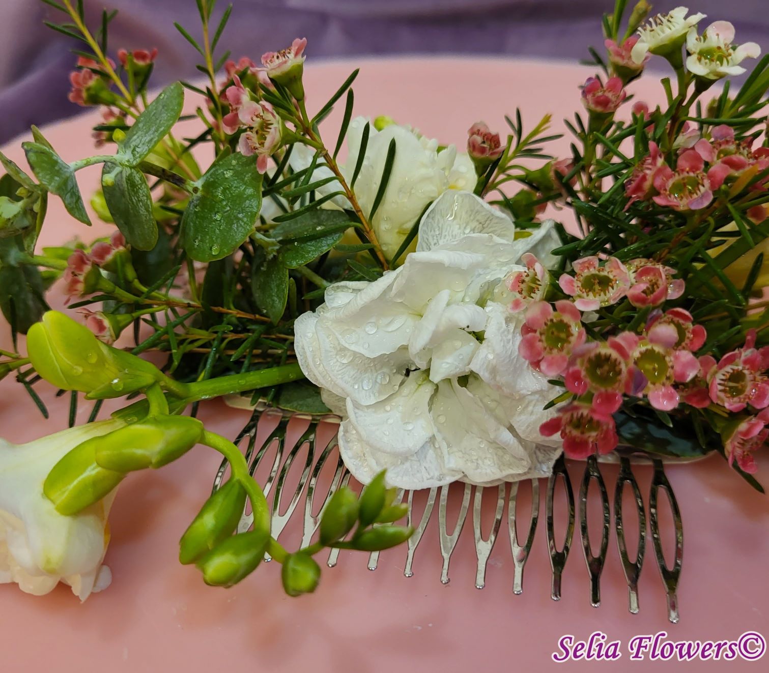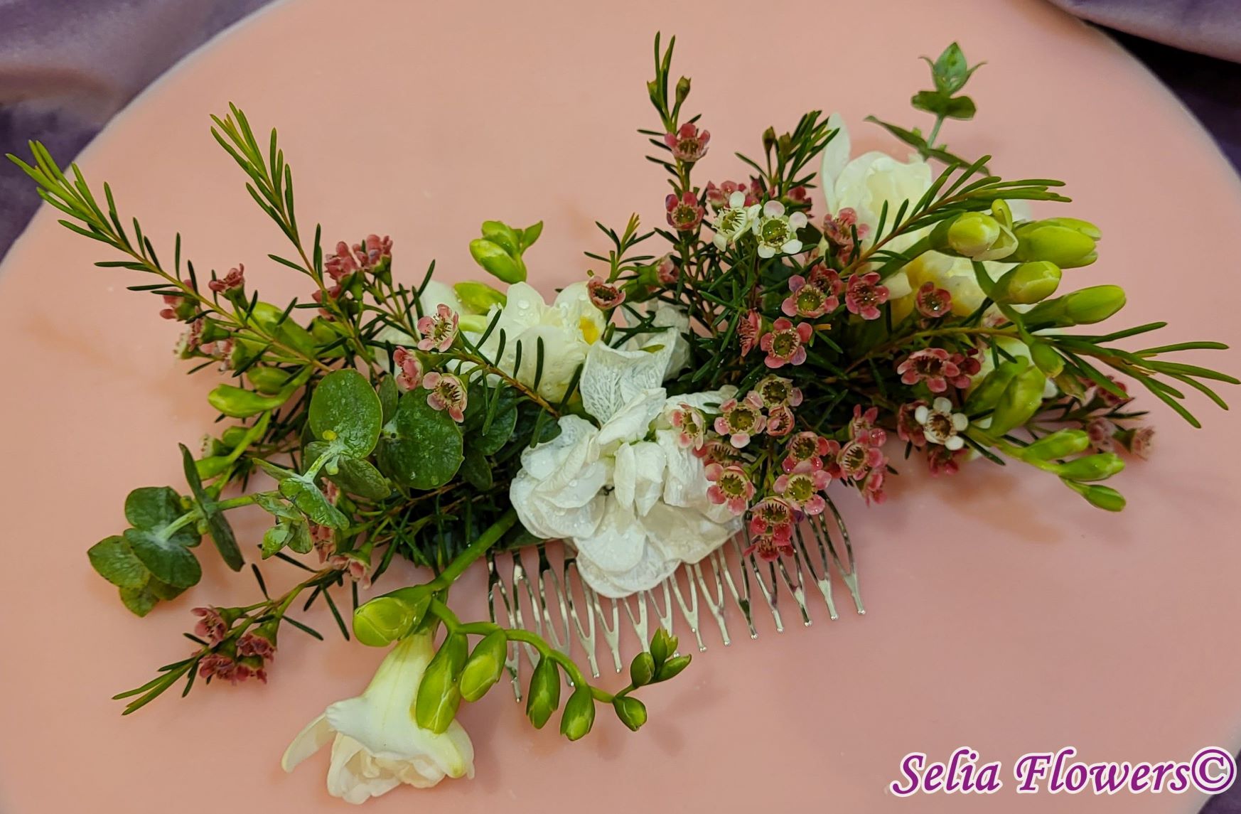 Compoziție florală: frezii, flori de mathiola, wax flowers, eucalipt.
