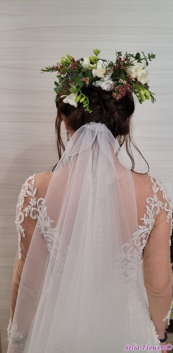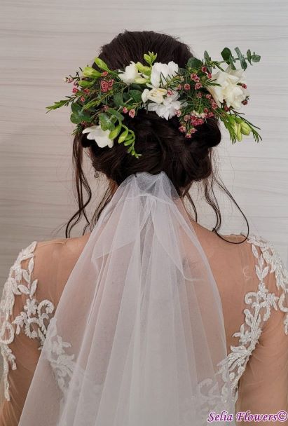 Accesoriu de păr pentru mirese, tip bijuterie, decorat cu flori naturale.