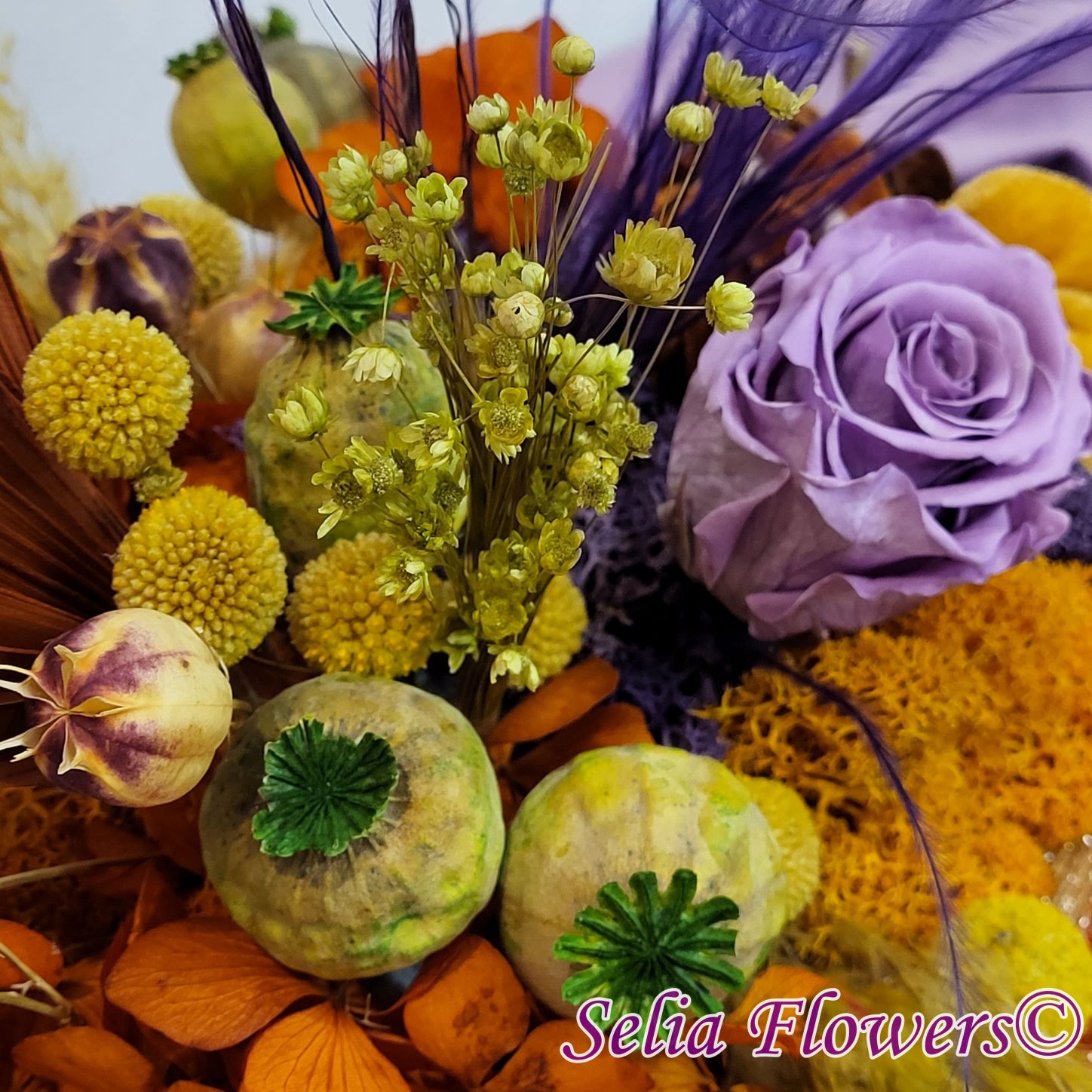 Un dovleac handmade, realizat în cromatica toamnei. Are o structură spiderweb construită și este decorat cu flori naturale permanente: hortensie și trandafir criogenate, craspedia, stipa, nigella, capsule de mac și iarbă de pampas. Este accesorizat cu licheni naturali stabilizati, minidovleci din material textil și frunze de palmier.