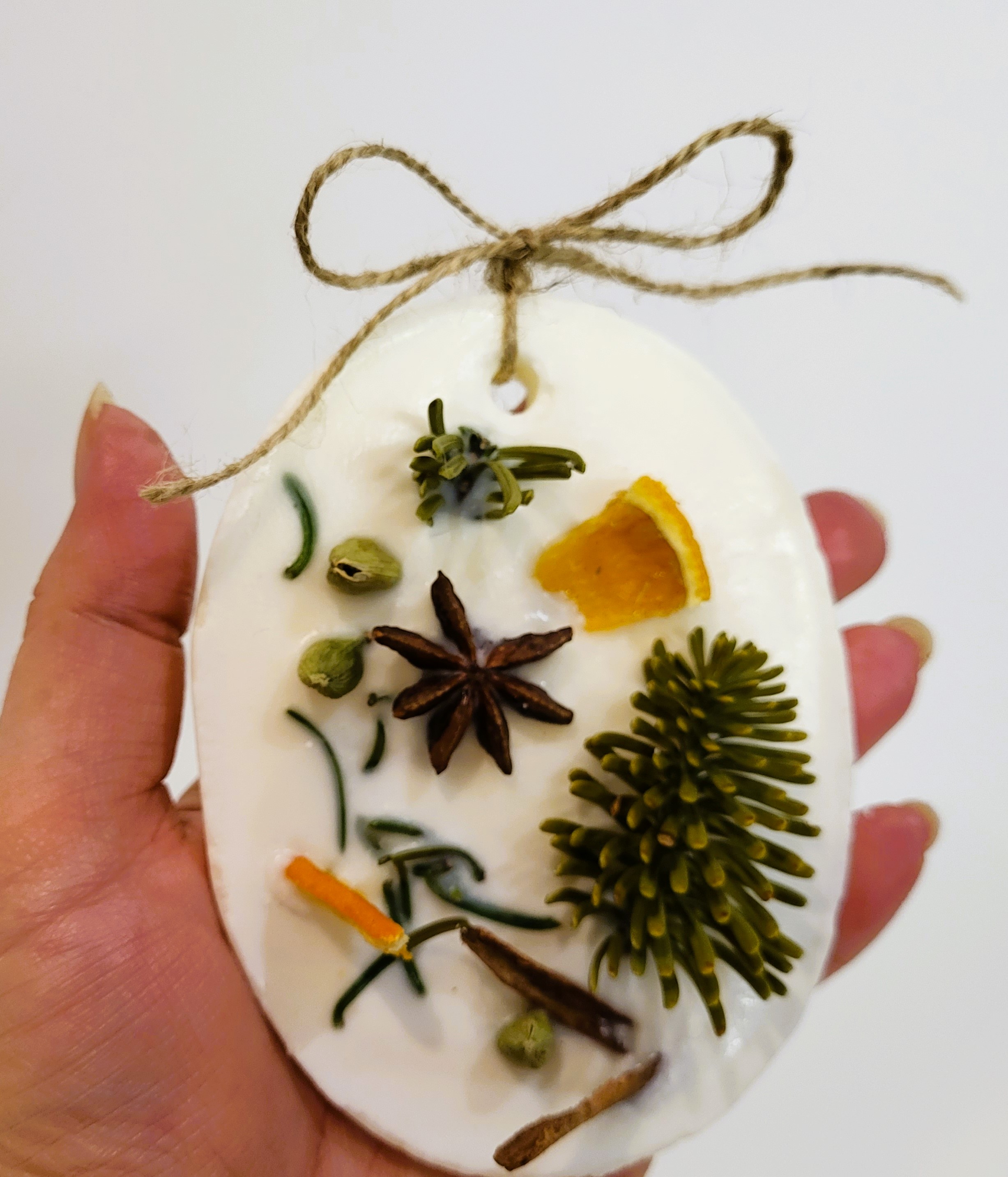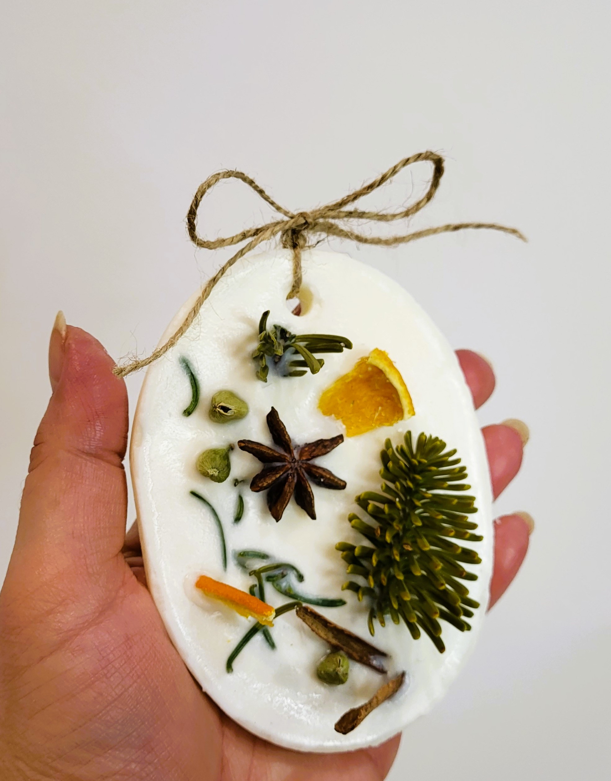 Tableta este turnată manual din ceară de soia de calitate premium. Este parfumată cu uleiuri pure organice de pin, brad, scorțișoară și portocale și este decorată cu crenguțe de brad și mirodenii specifice Sărbătorilor de iarnă (cardamon, scorțișoară, cuișoare, portocală deshidratata). Are o greutate de aproximativ 70 gr.