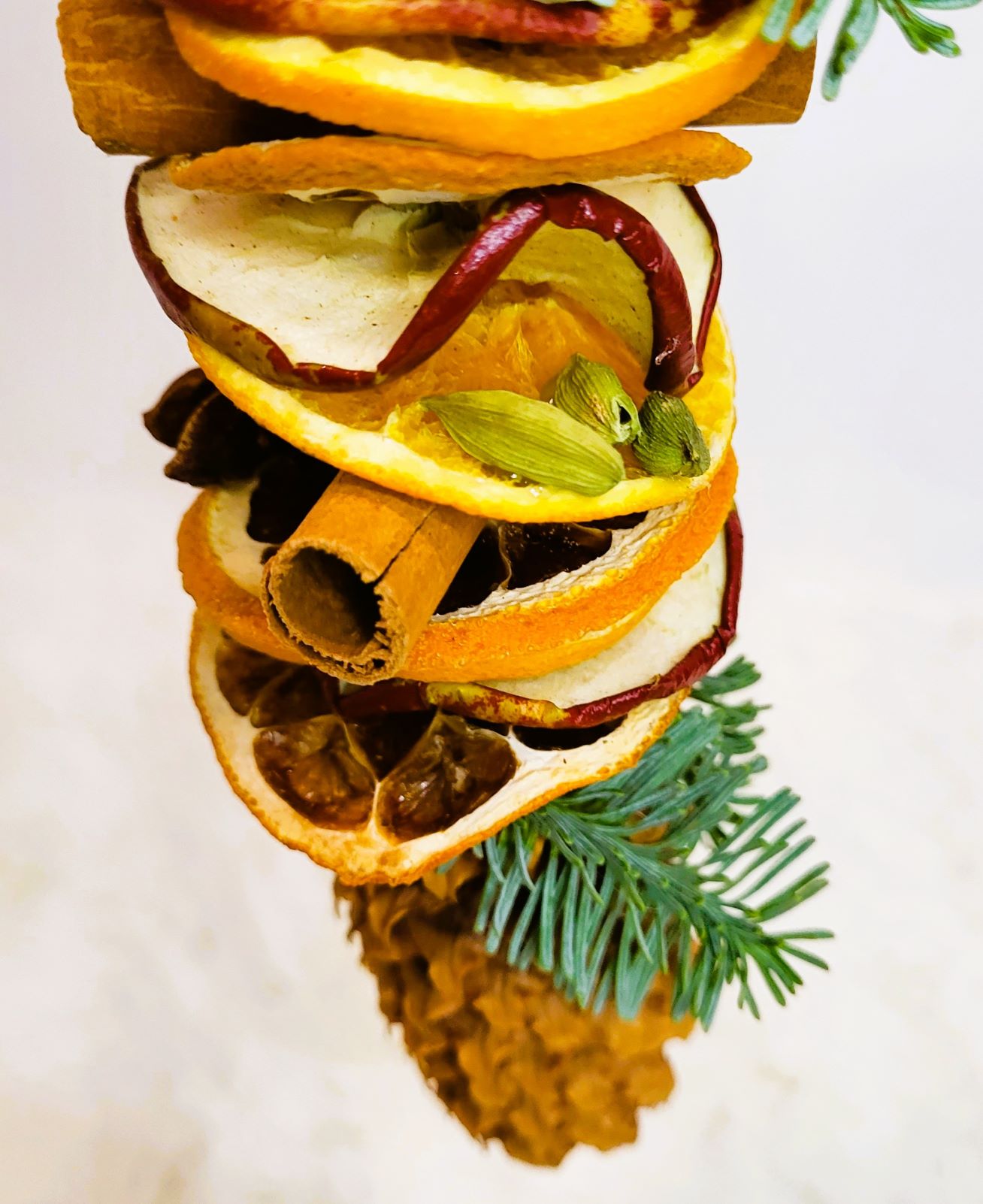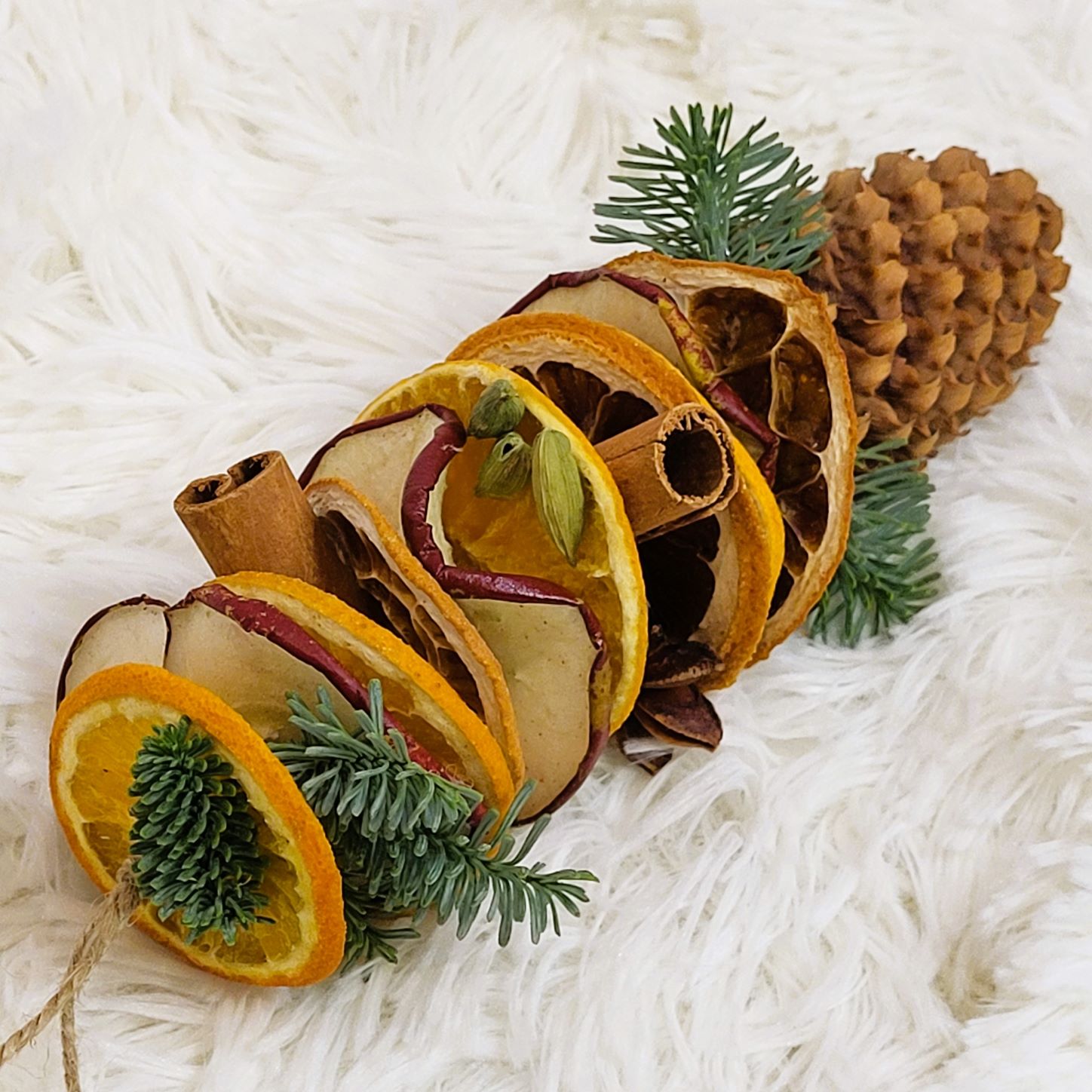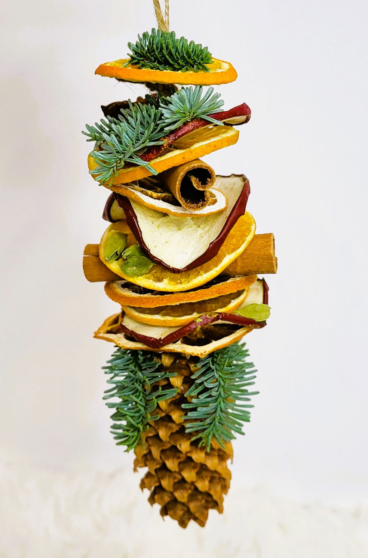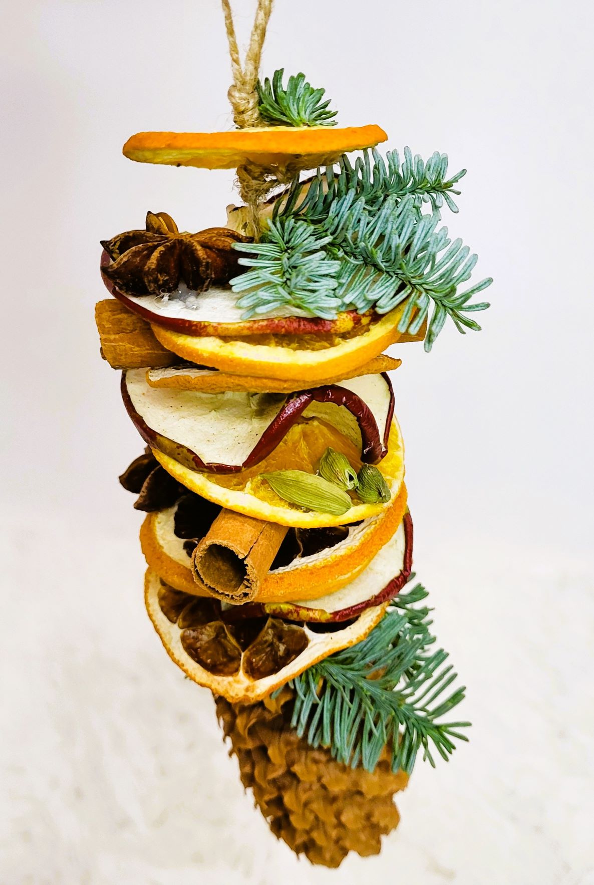 Un glob natural sub forma unei decorațiuni construită cu: felii de fructe deshidratate - mar, grapefruit, portocală; batoane de scorțișoară; anason; cardamon; con și crenguțe de brad. Lungimea decorațiunii este de aproximativ 16-18 cm.