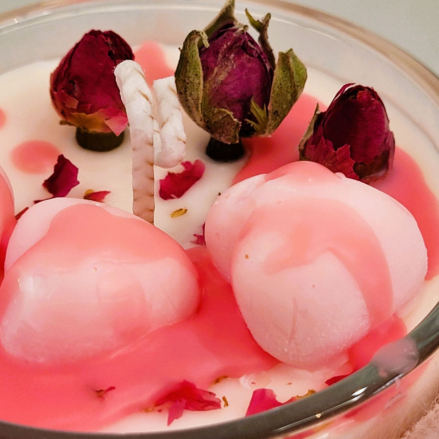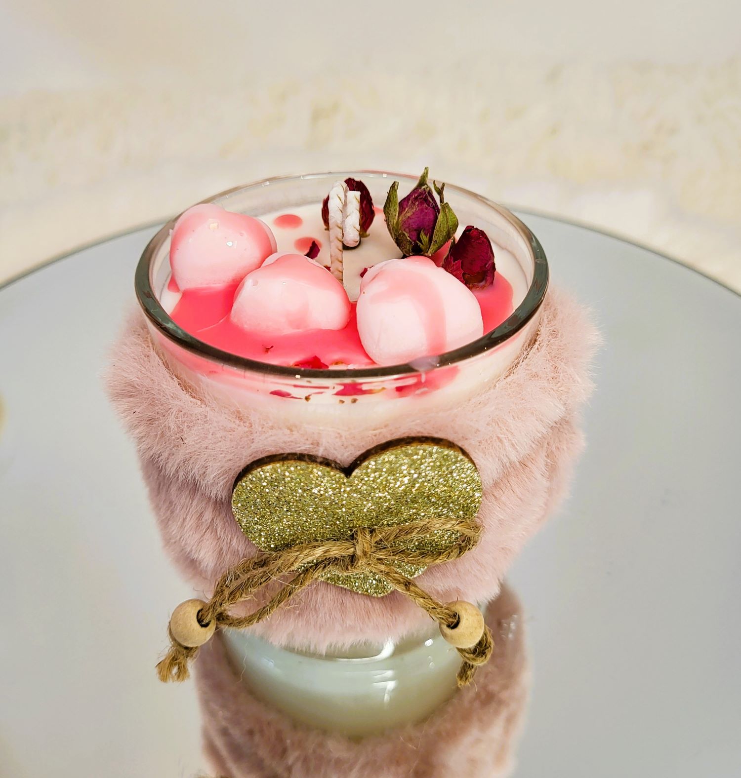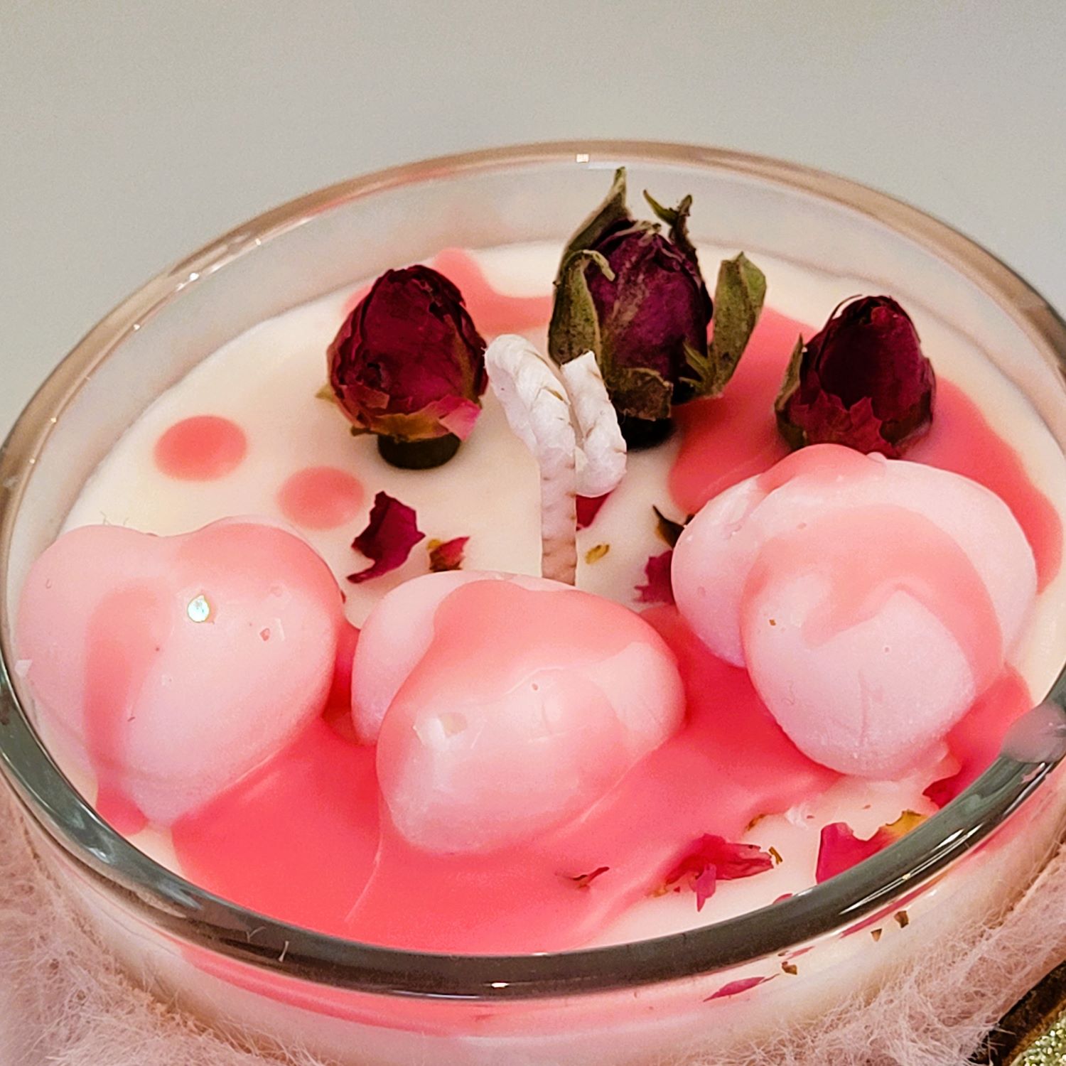 Lumânare handmade din ceară de soia, turnată în recipient de sticlă prevăzut cu blăniță și accesoriu inimioară. Este decorată cu boboci de trandafir și inimioare de culoare roz și îmbogățită cu arome de vanilie, iasomie și spring floral. Greutate, 275 g.