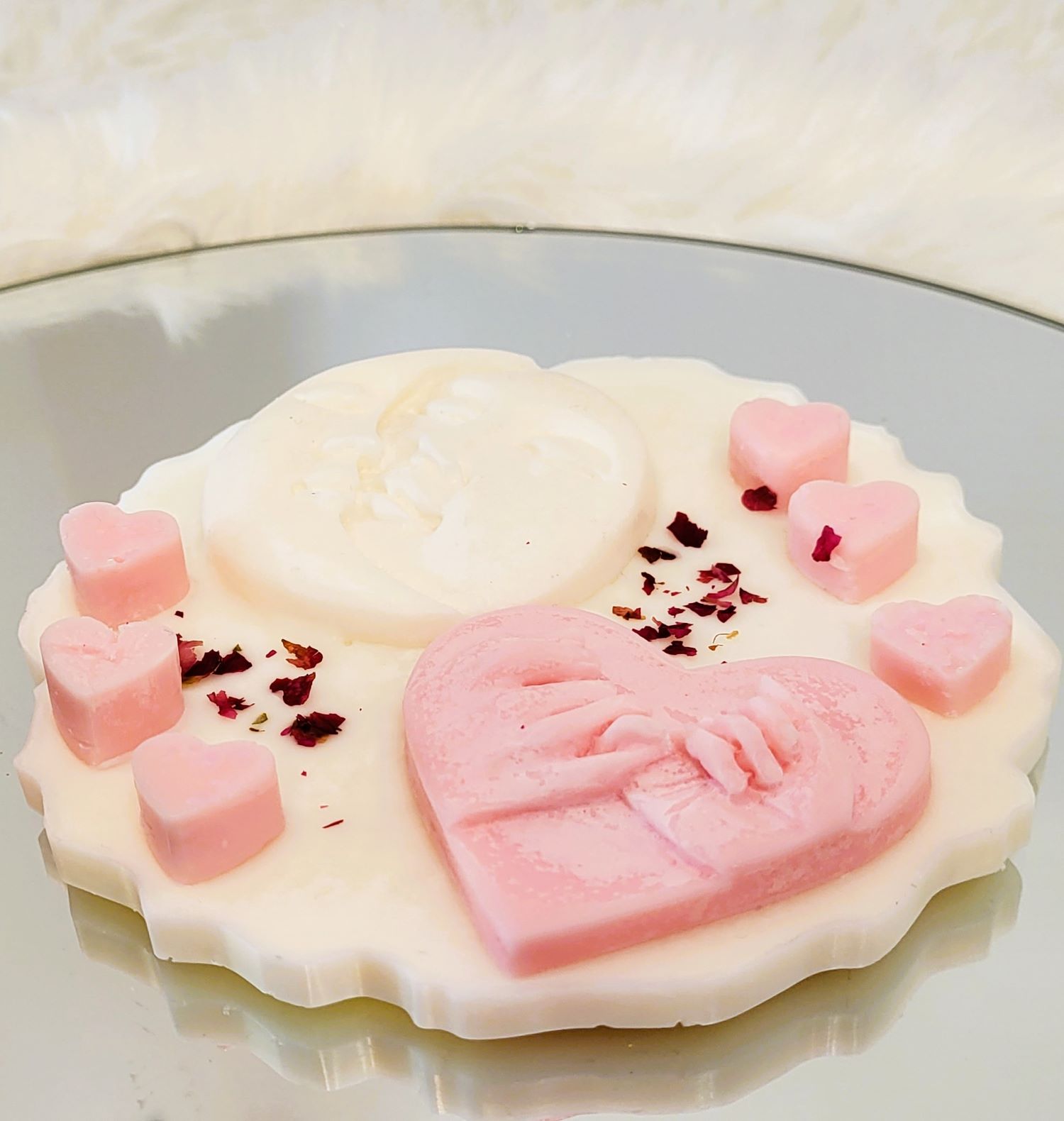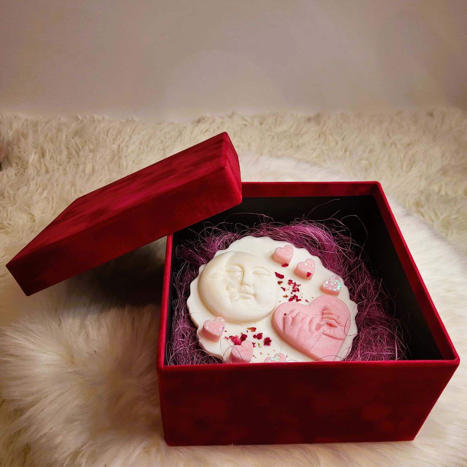 O tabletă delicată realizată din ceară de soia și accesorizată cu elemente sugestive din ceară. Poartă cu ea un mix de arome de Velvet Rose&Yasmine, Roasted Coffee și Spring floral. Ambalată într-o cutie de catifea, devine un dar special și inspirat pentru cineva drag.