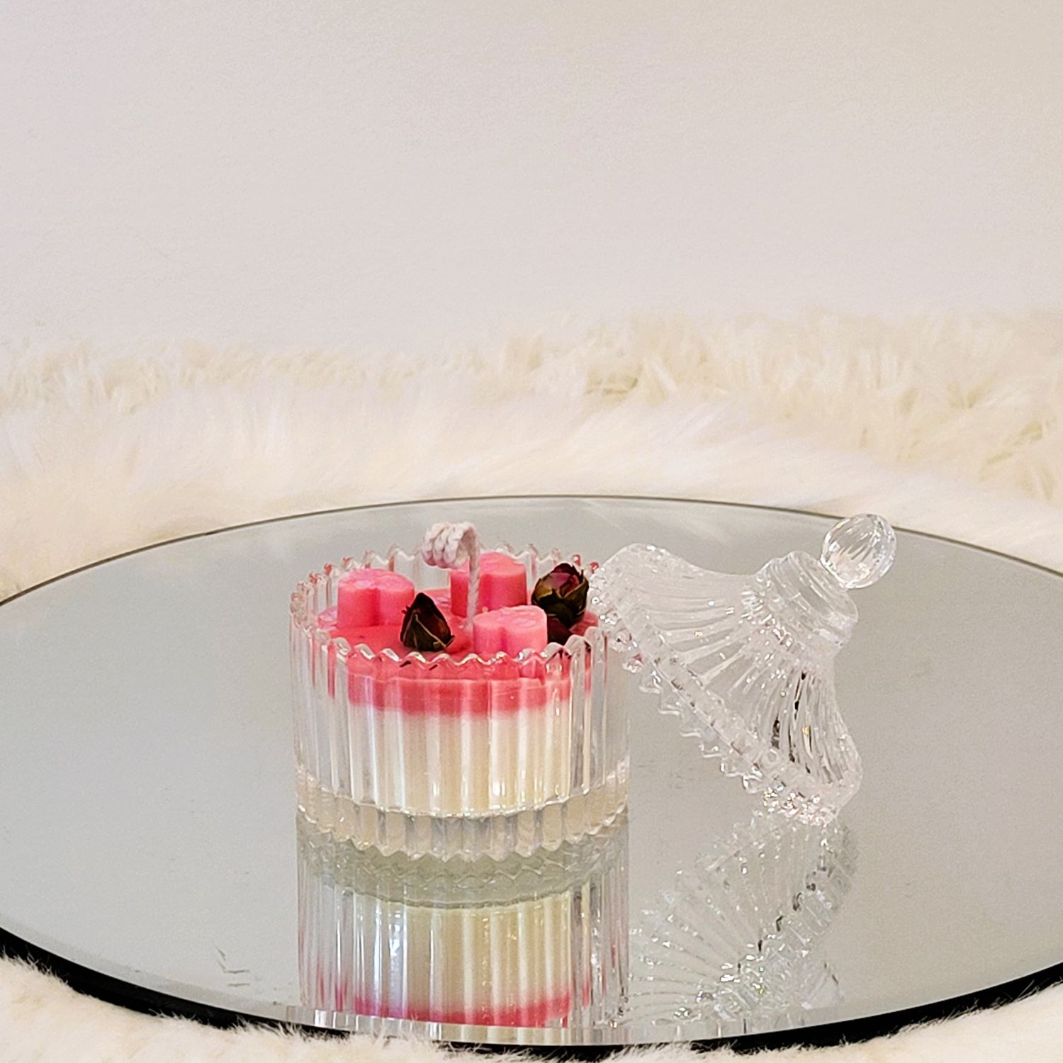 Lumânare parfumată handmade din ceară de soia, turnată în recipient ceramic tip bombonieră. Este decorată cu inimioare din ceara si boboci de trandafiri și îmbogățită cu arome de Velvet Rose&Yasmine, Roasted Coffee și Spring floral. Greutate, 110 g.