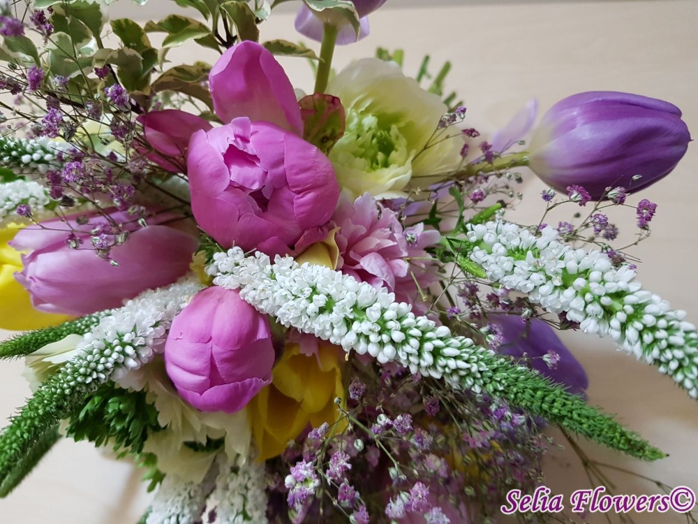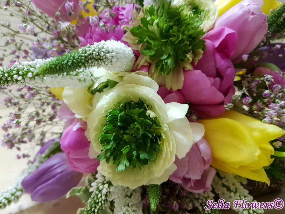 Buchet realizat din lalele, veronica, ranunculus, bujori, gypsophilla roz si accesorii.