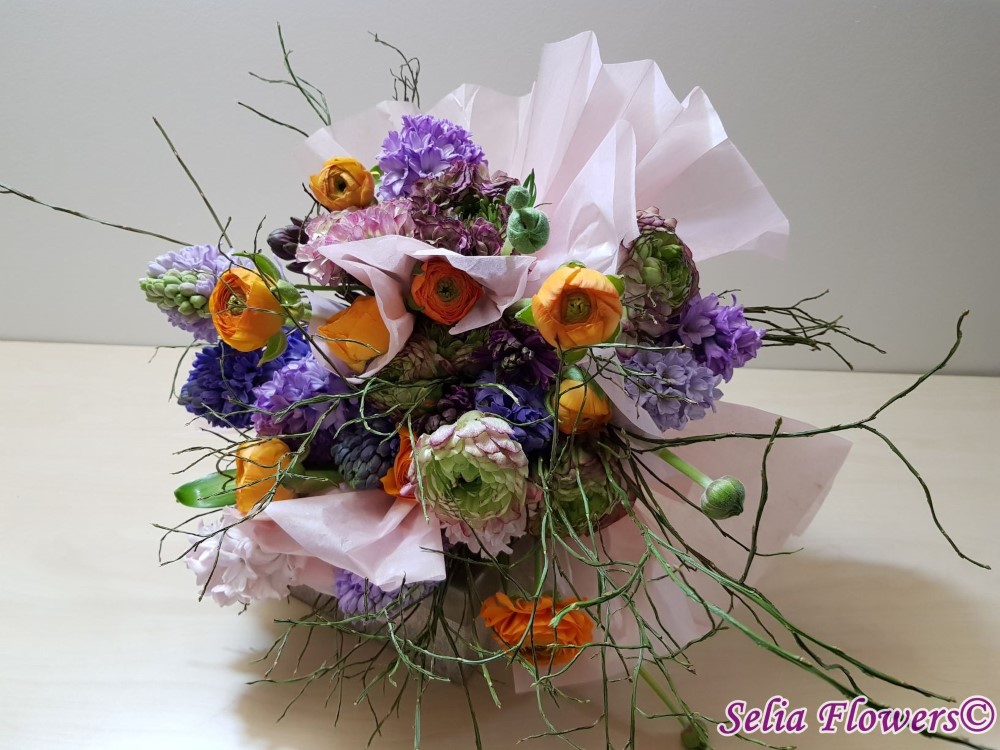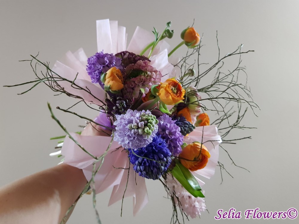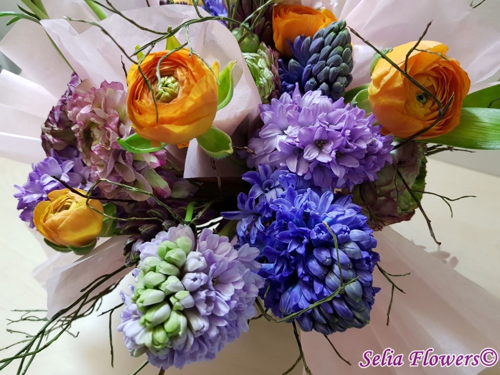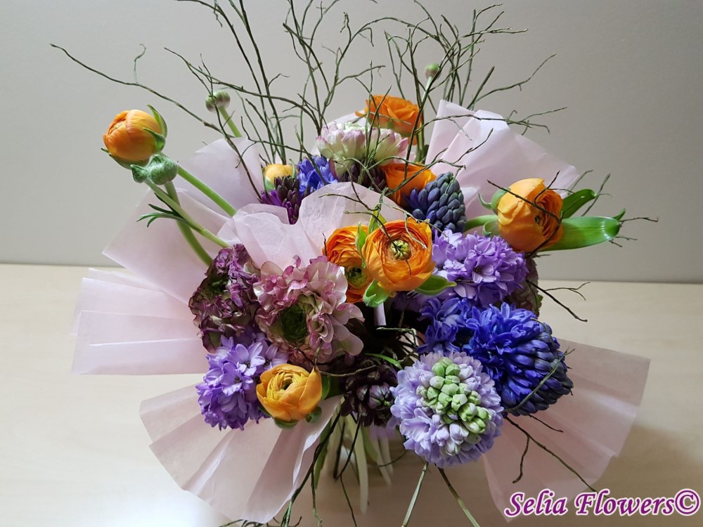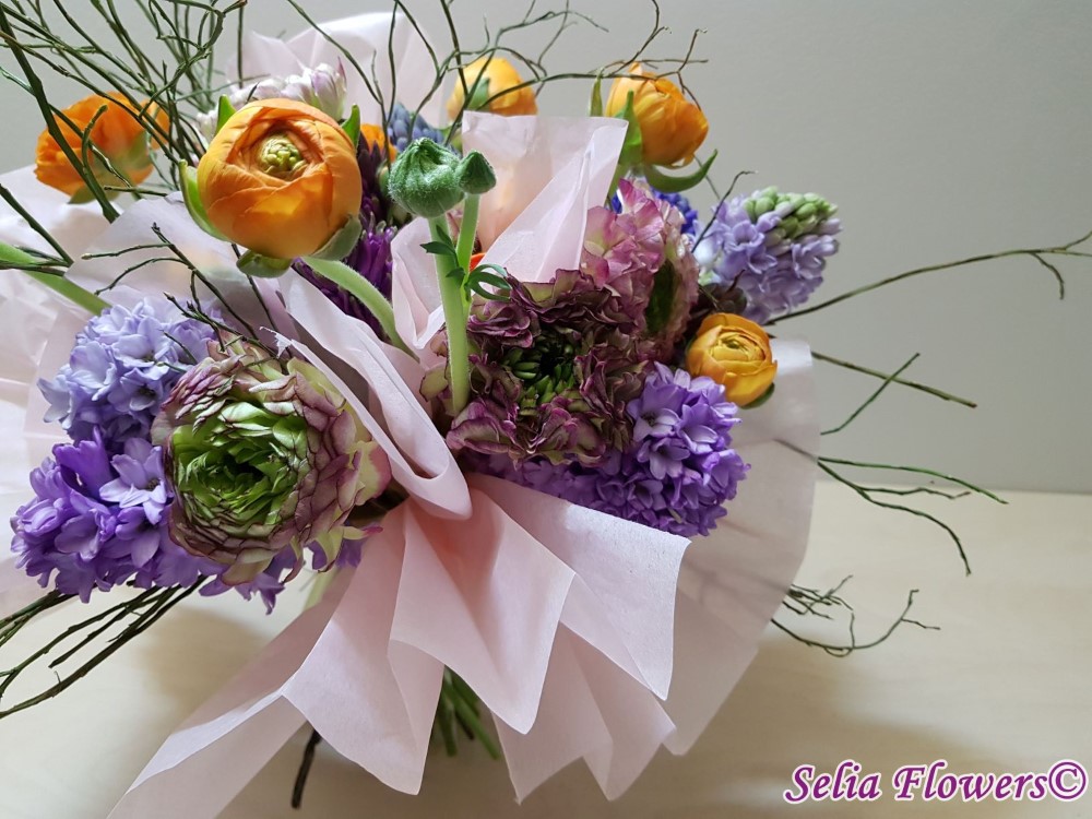 Primavara autentica: un buchet construit cu 9 zambile, 16 fire de ranunculus, heidelbeer, accesorizat cu hartie din matase.