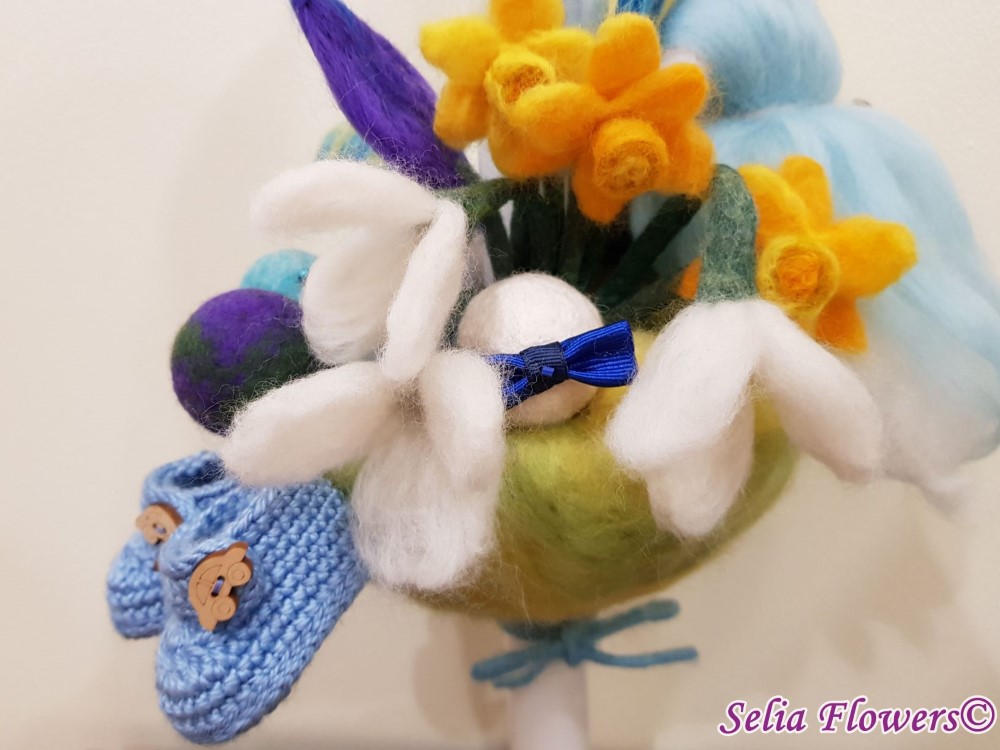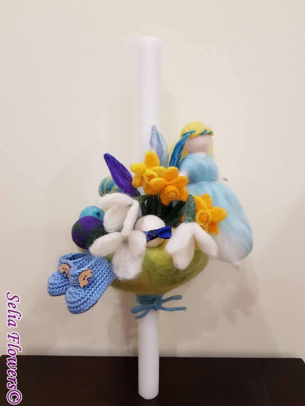 Lumanare de botez pentru baietel, realizata handmade pe semisfera imbracata cu lana, cu flori si ghemulete de lana, ghemulete si botosei din material acril si zana din lana.