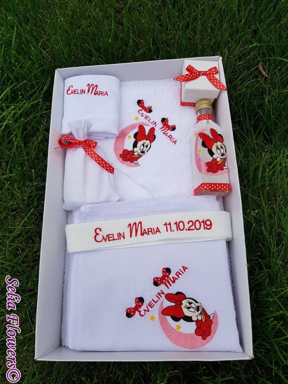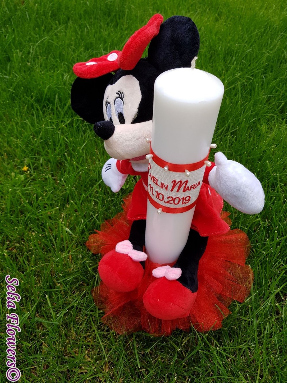 Lumanarea este decorata cu rochita din organza lucrata manual si broderie personalizata cu numele si data evenimentului, este accesorizata cu panglica din saten si papusa Minnie mouse si are o inaltime de 45 cm .