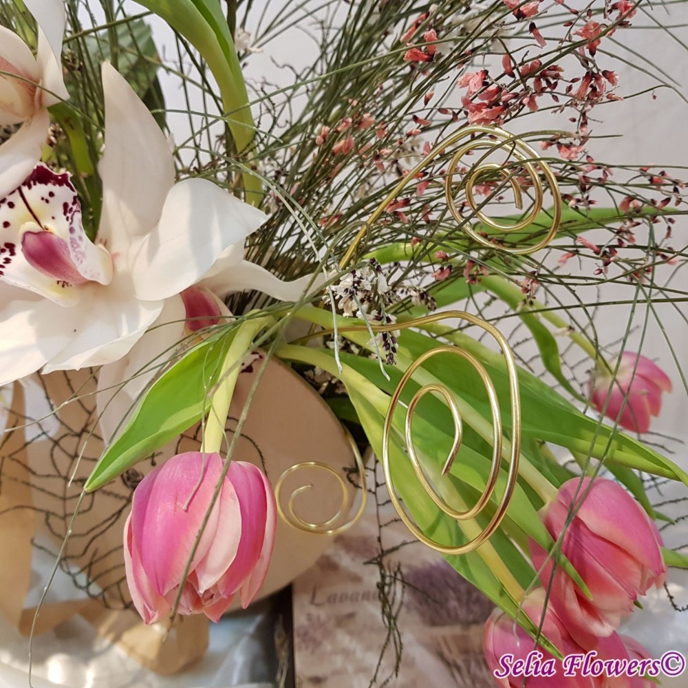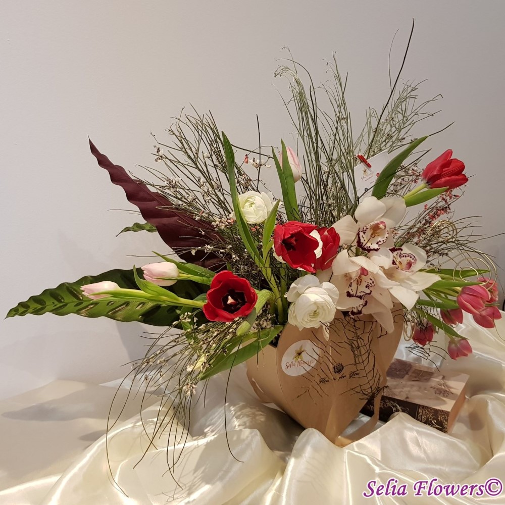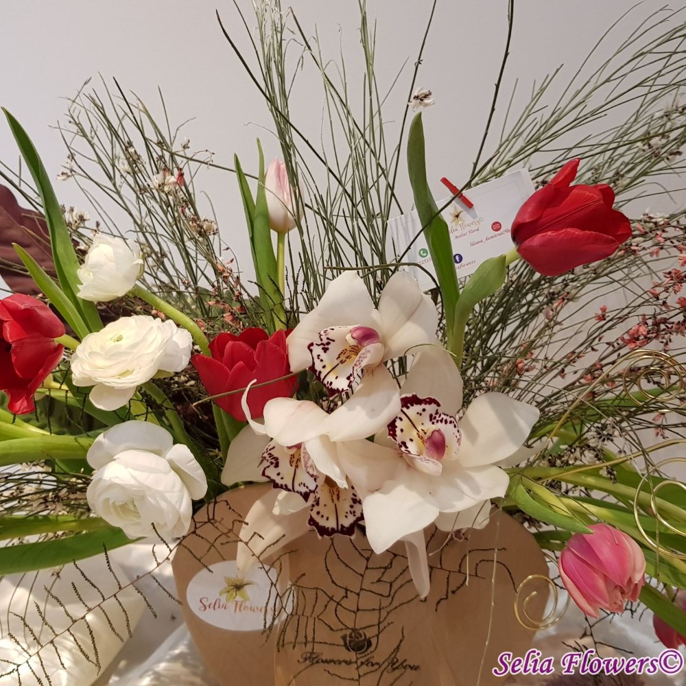 Compozitie: orhidee cymbidium, lalele in doua culori, ranunculus, ginster in 2 culori, verdeata, accesorii din sarma floristica.