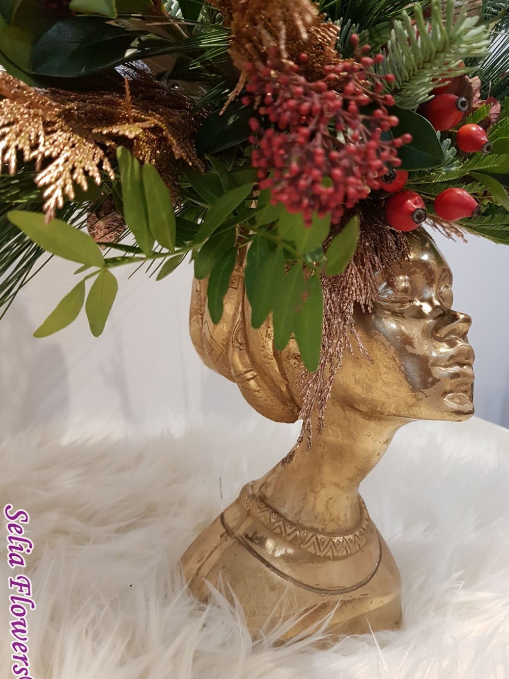 Aranjament in vas Mayra, construit in suport de burete umed, cu trandafiri Red Naomi, skimmia, hydrangea uscata, anthurium, crengute maces, fire papaverus vopsit, crengute decor si mix de conifer (crengute tuia vopsita, pin si brad natural argintiu).