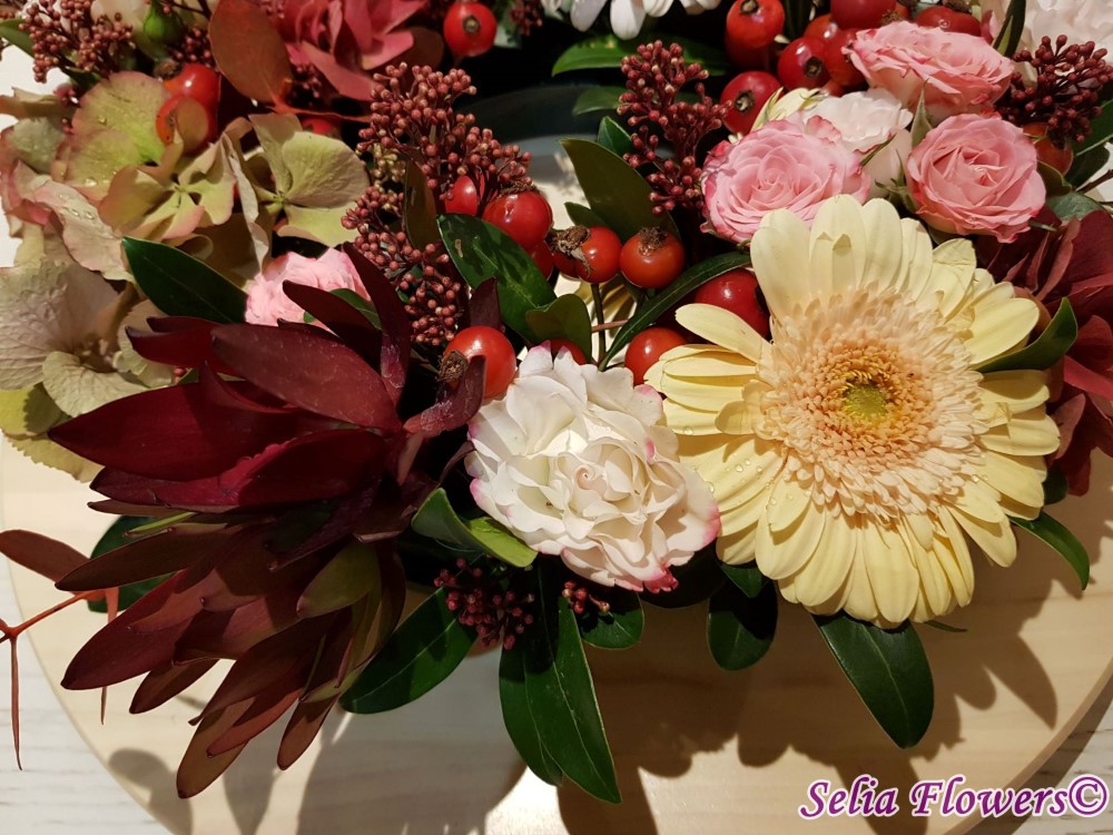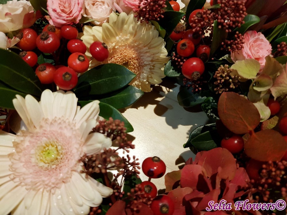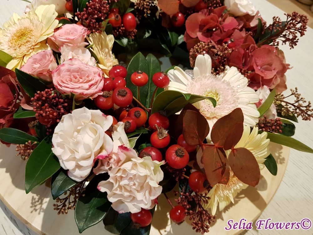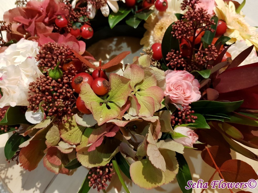 Coronita de toamna decorata cu flori naturale: hydrangea in doua culori, germinis, macese, trandafiri tros, leucadendron, skimmia, eucalypt. Baza coronitei este un inel prevazut cu burete floral umed cu un diametru initial de 25 cm (la livrare aproximativ 30-35 cm. Buretele floral asigura hidratarea florilor si mentinerea lor pentru o perioada mai indelungata.